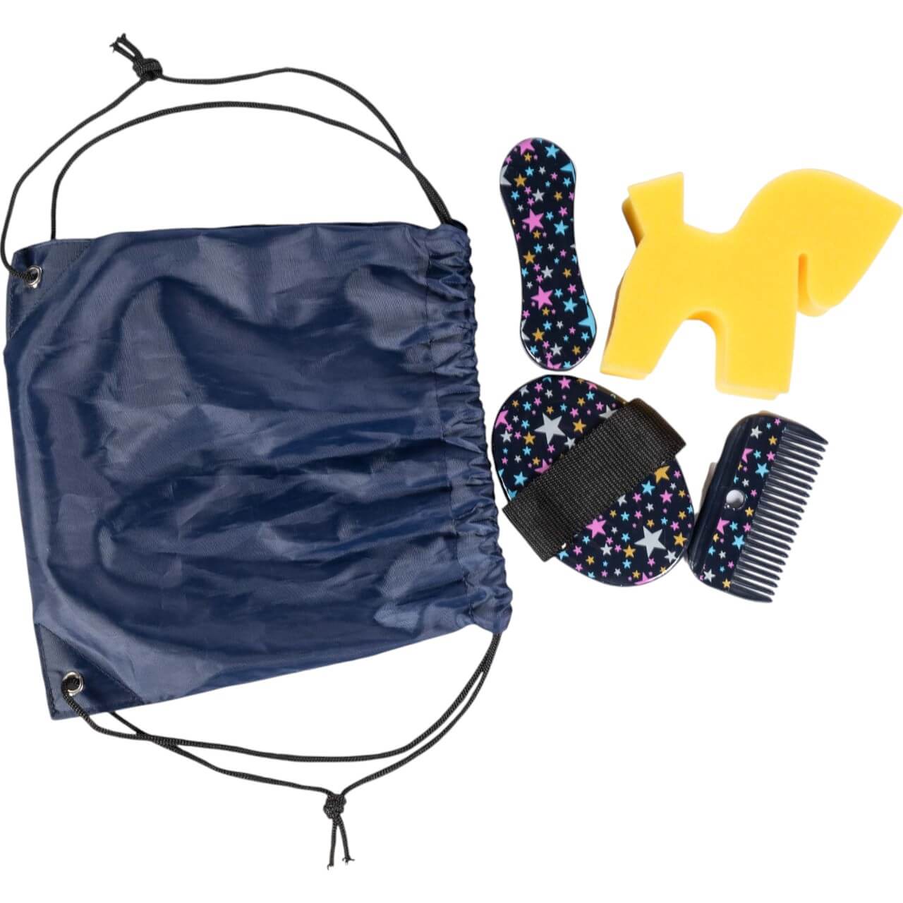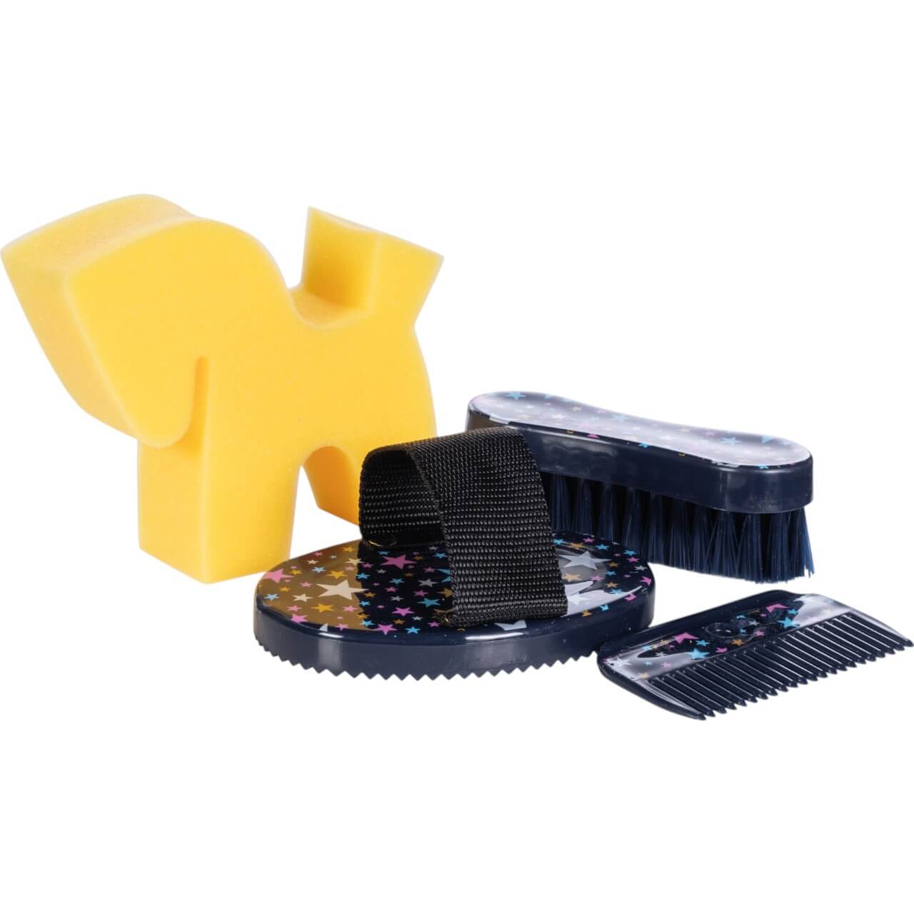 Das Putzset besticht durch seine navyblaue Farbe und das bezaubernde Sternenmuster, das jedem Artikel eine magische Note verleiht. Diese liebevollen Details machen das Set zu einem Hingucker und bringen Freude in den Alltag kleiner Reitsportbegeisterter. Die kindgerechten Utensilien sind nicht nur schön anzusehen, sondern auch optimal für kleine Hände gestaltet.