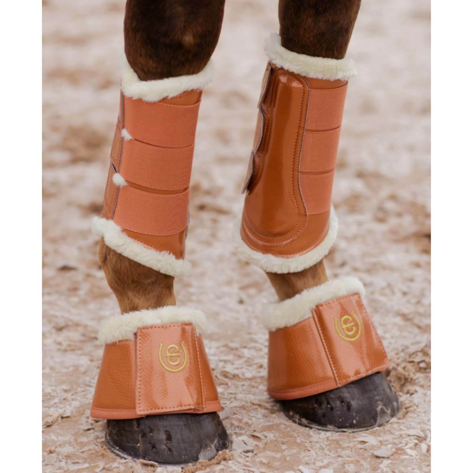 Gamaschen Bronze Gold FS 2022 Beinschutz von Equestrian Stockholm kombinieren stilvolles Design mit optimalem Schutz für dein Pferd. Diese hochwertigen Gamaschen aus glänzendem PU-Leder in edlem Bronze Gold bieten nicht nur einen sicheren Halt, sondern auch ein unvergleichlich weiches Tragegefühl dank des kuscheligen Teddyfells.