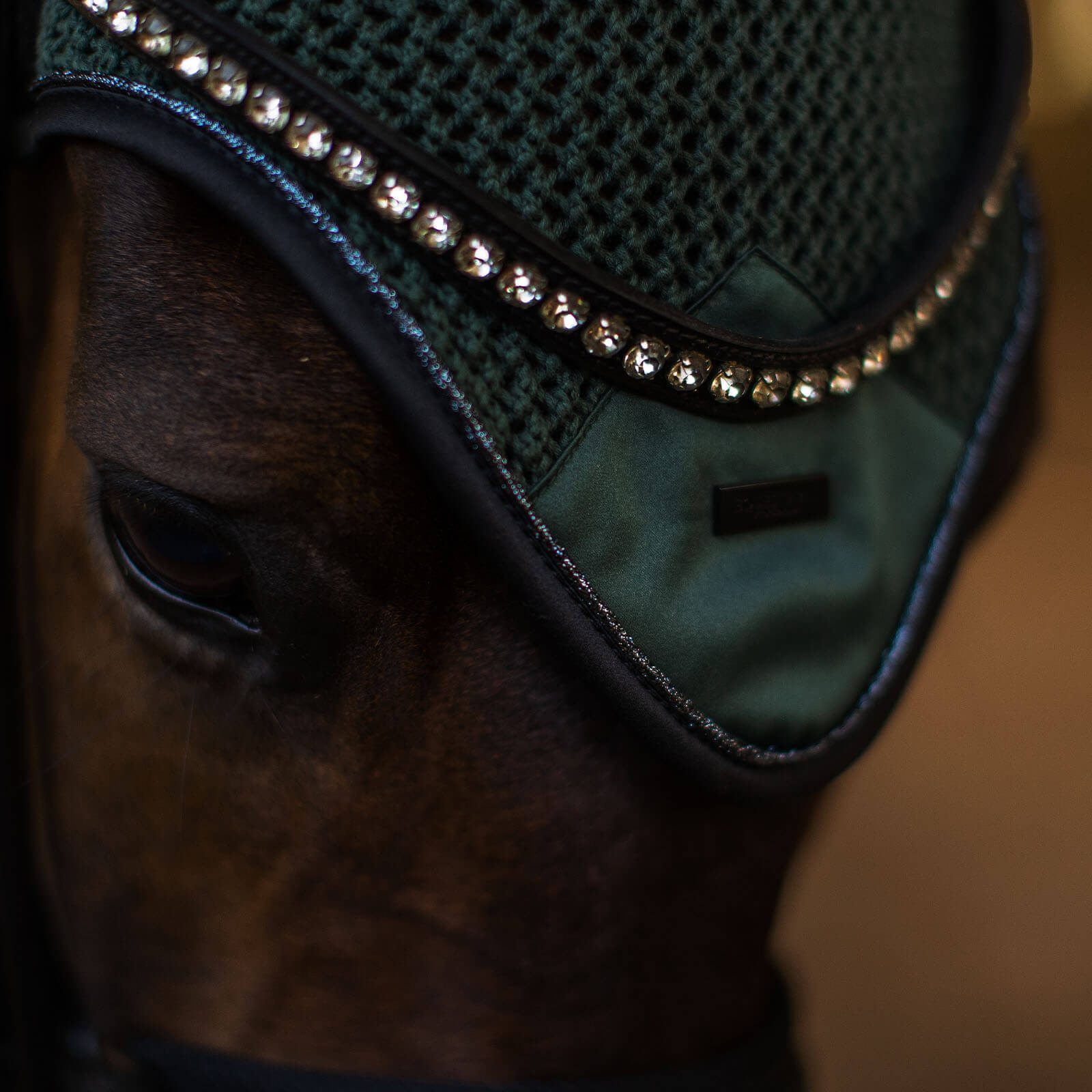 Die Fliegenmütze Sycamore Green besticht durch ihre kühle, dunkelgrüne Farbe, die jedem Pferd einen edlen Look verleiht. Der gehäkelte Stoff aus 100% Baumwolle wird durch ein glänzendes, dunkelgrünes Satin-Patch sowie schwarze Metallic-Paspeln stilvoll ergänzt. Diese ästhetischen Details sorgen nicht nur für eine ansprechende Optik, sondern bieten auch praktischen Nutzen durch das elastische Material an den Ohren, das sich perfekt anpasst.