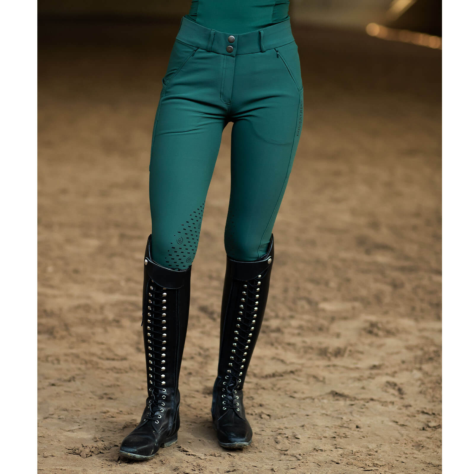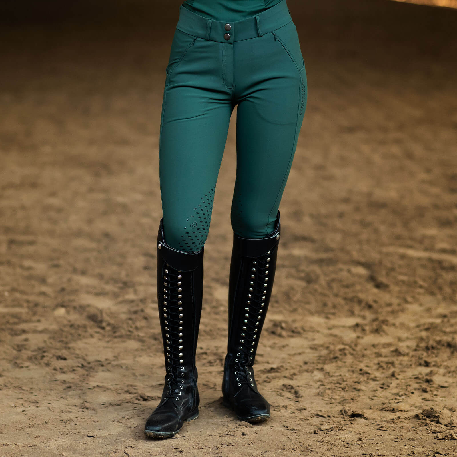 Die Reithose besticht durch ihr kühles Dunkelgrün, das dich zum Blickfang macht. Das minimalistische Equestrian Stockholm Logo verleiht der Hose eine edle Note. Mit einem mittelhohen Bund und vier Taschen bietet sie sowohl Stil als auch Praktikabilität – perfekt für jede Reiterin, die Wert auf modisches Auftreten legt.