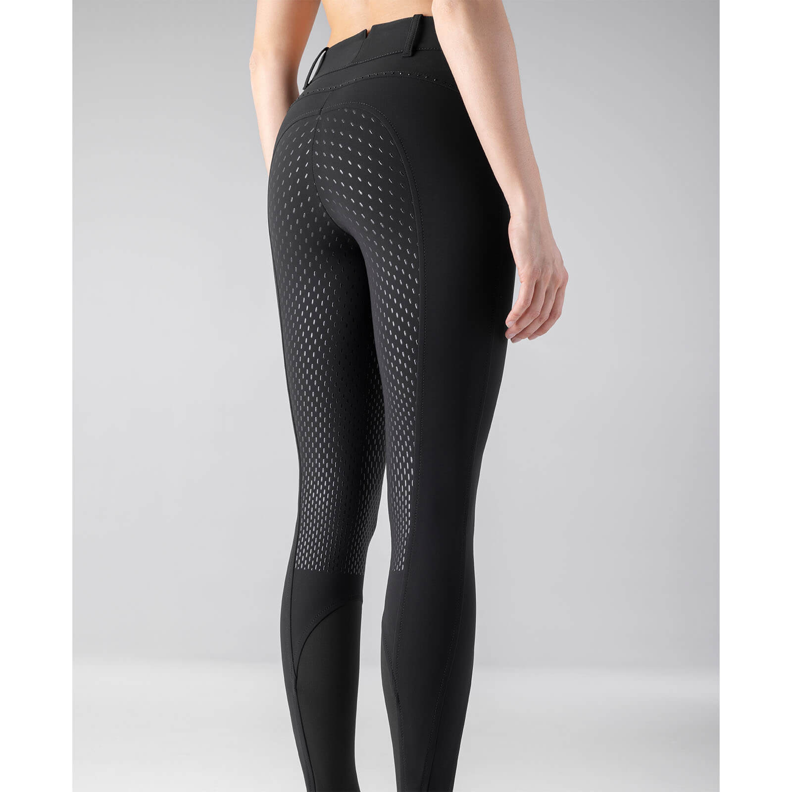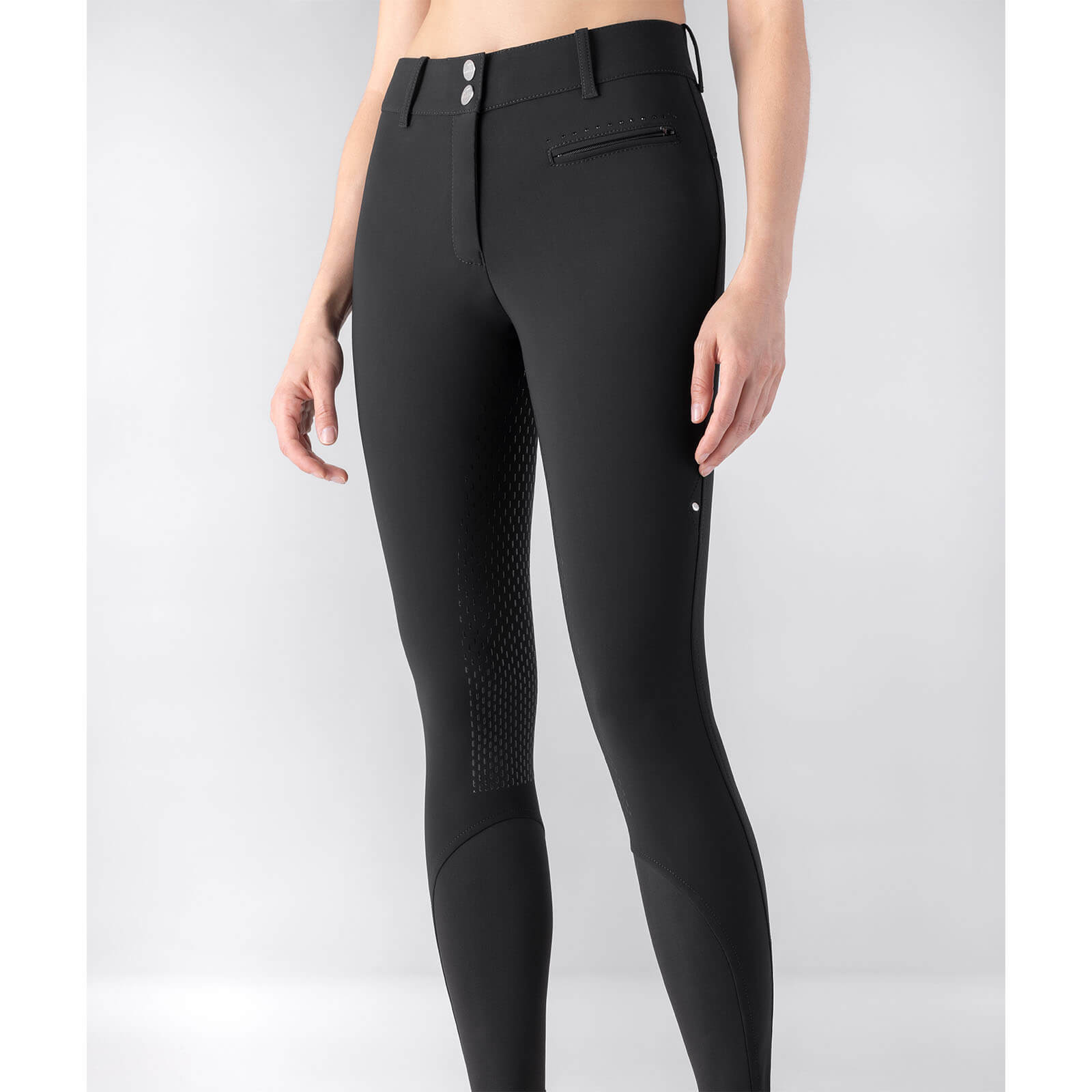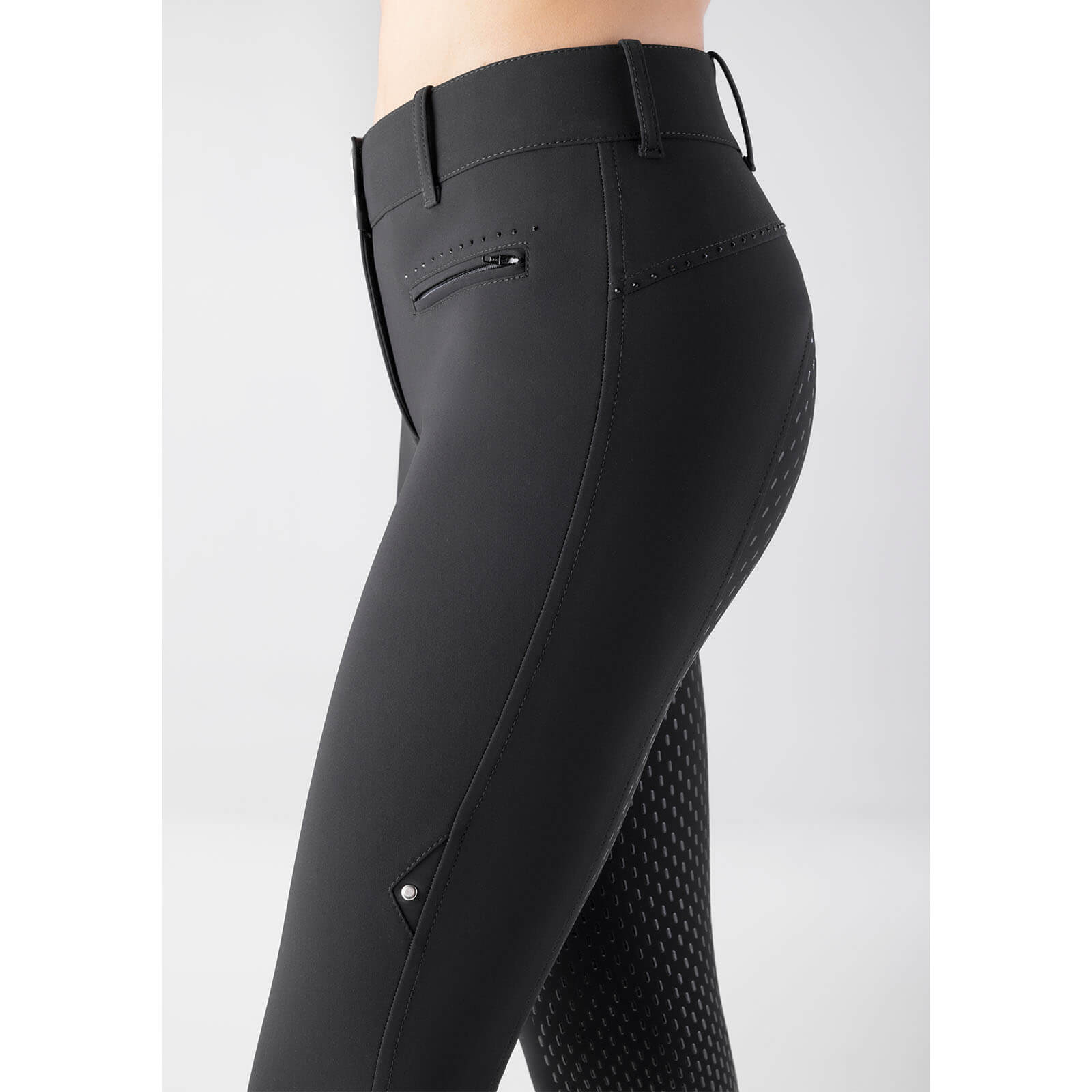 Die sorgfältig platzierten Ton-in-Ton-Strasssteine auf der Vordertasche und am Hinterteil machen diese Reithose zu einem echten Hingucker. Die zeitlose Farbe Black ergänzt jedes Reitoutfit und setzt deine Silhouette perfekt in Szene. Dank des hohen Bundes profitierst du von einer optimalen Passform, die sowohl für das Auge als auch für den Komfort ein Gewinn ist.