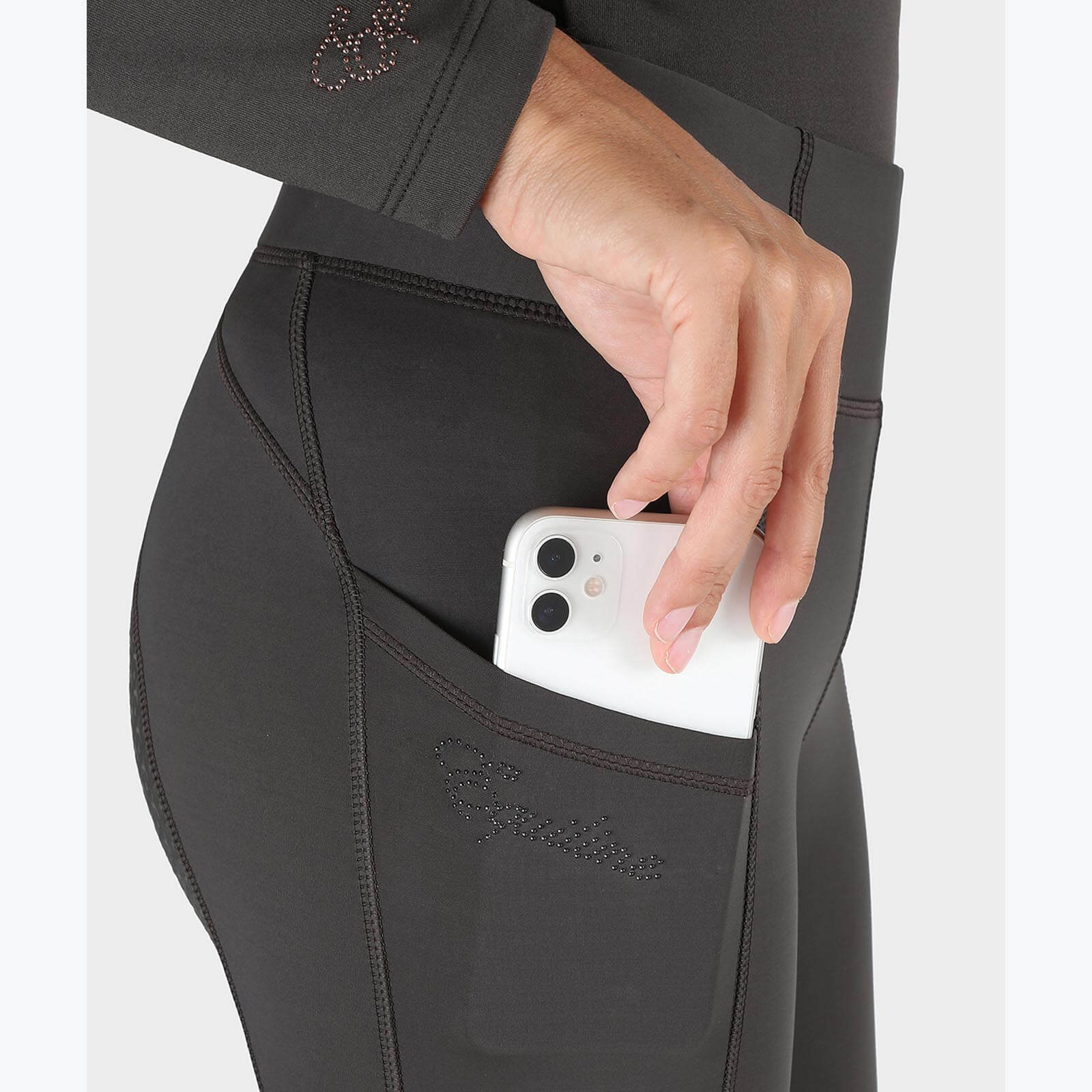 Das innovative Full Grip-System dieser Damenreitleggings garantiert einen festen Sitz im Sattel, egal ob du Dressur, Springreiten oder im Gelände unterwegs bist. Dank des hohen Elasthan-Anteils von 24% und 76% Polyamide passt sich die Leggings perfekt an deine Bewegungen an und bietet maximale Bewegungsfreiheit. Die praktische Handytasche auf der rechten Seite sorgt dafür, dass du immer erreichbar bist.