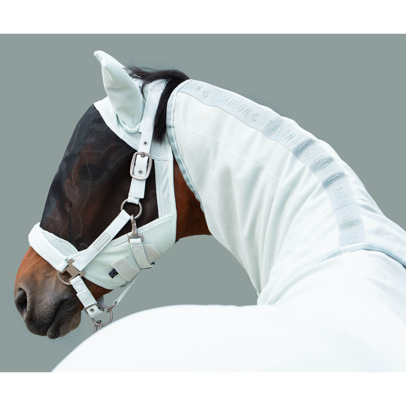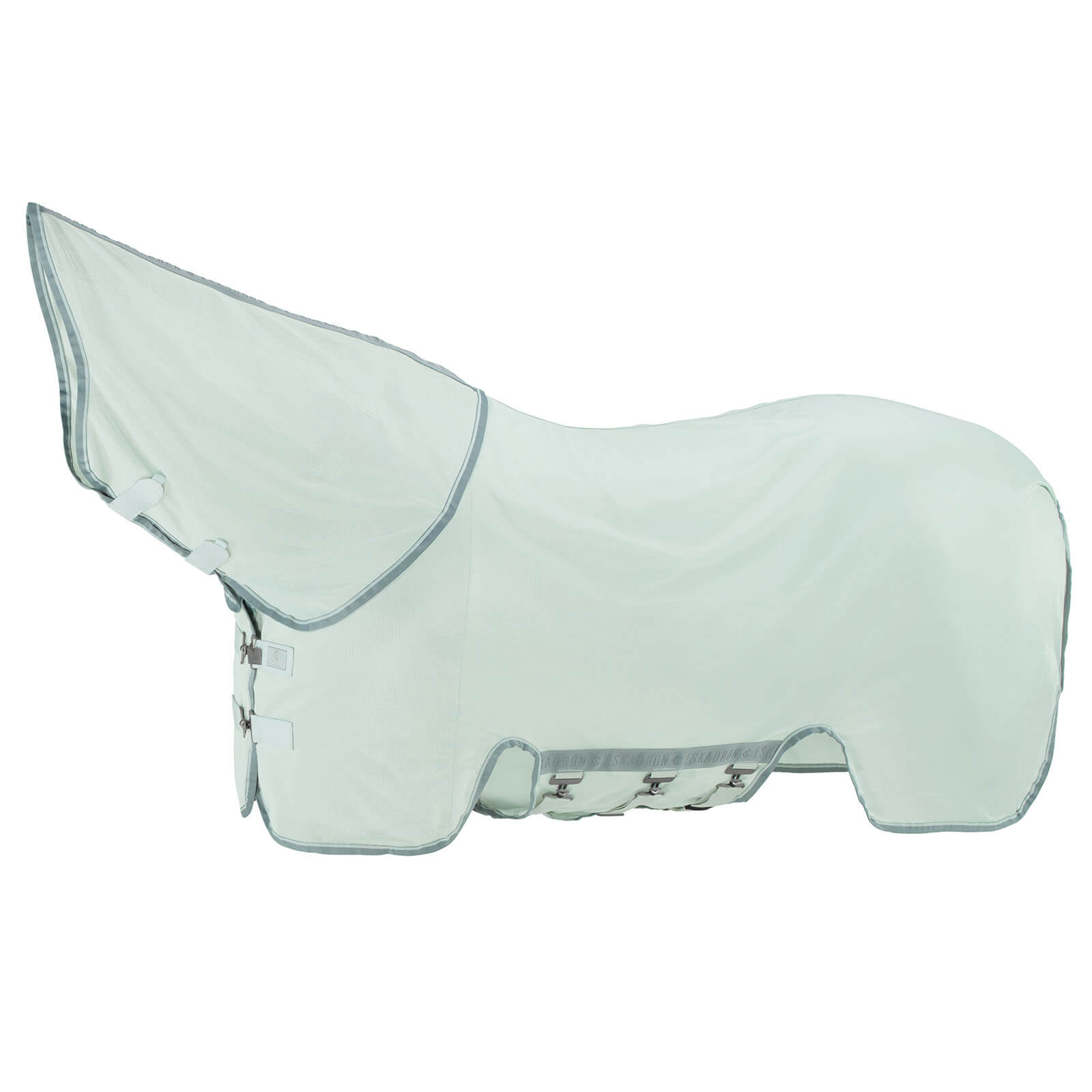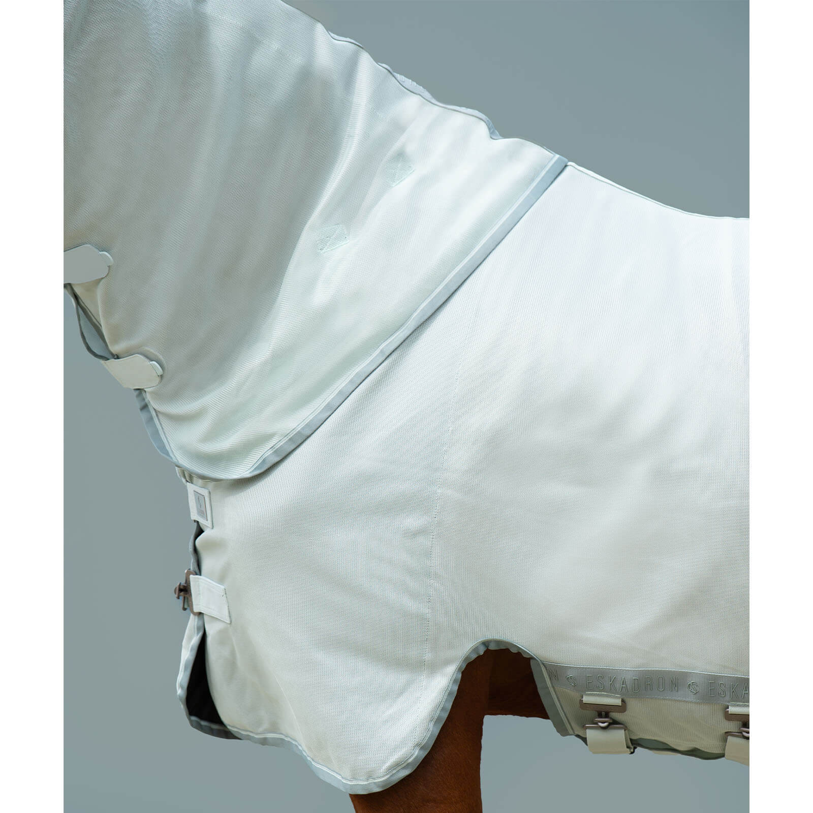 Die Fliegendecke Fly Detach-Neck Classic Sports FS 2024 besticht durch ihr modernes Design in eleganten Farbkombinationen wie Powder Green und Deep Taupe. Die kontrastierenden Streifen und die markanten Eskadron-Schriftzüge verleihen der Decke einen sportlich-eleganten Look. Das optisch ansprechende Design ist nicht nur ein Hingucker, sondern bietet auch funktionale Vorteile wie eine verbesserte Sichtbarkeit.