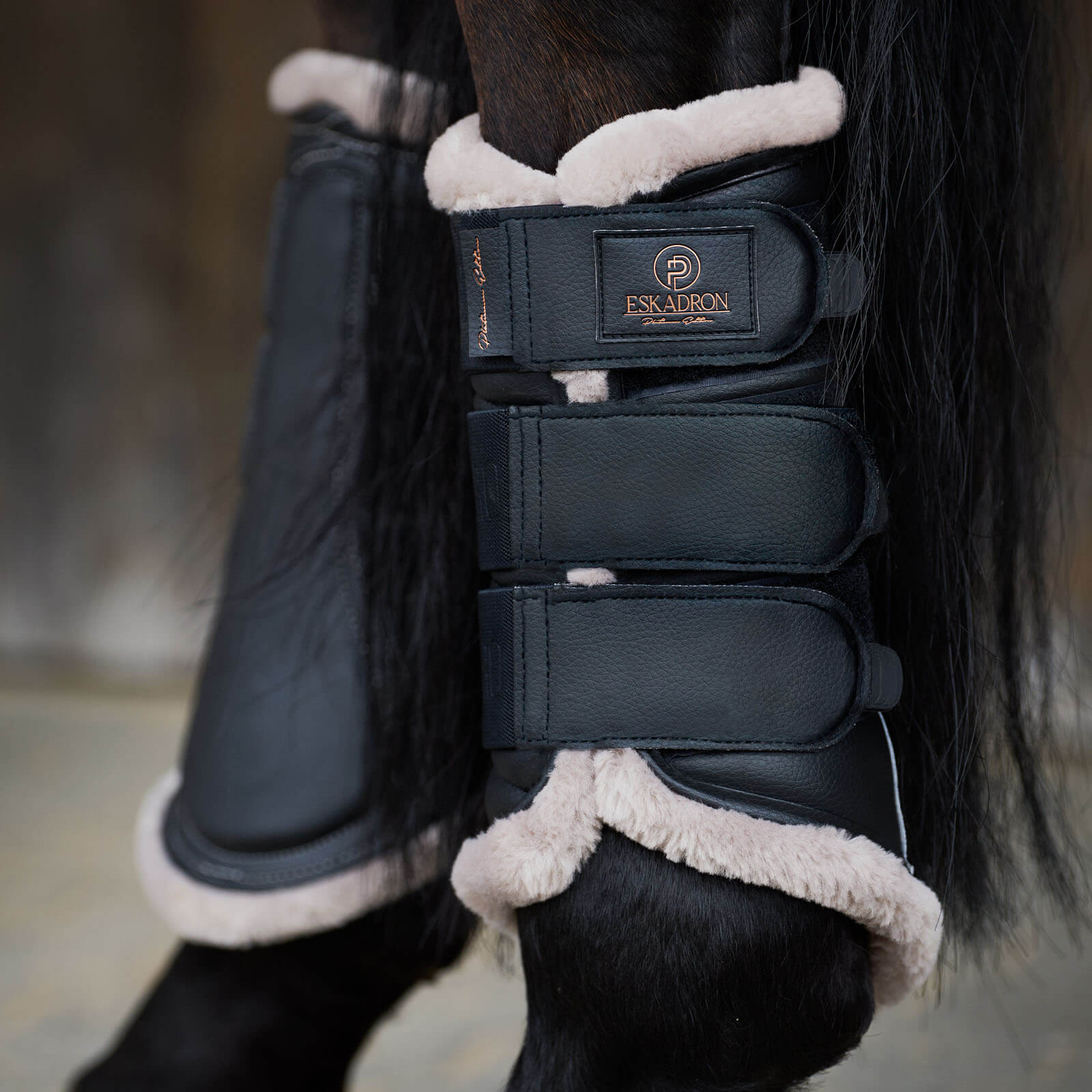 Gamaschen Faux Leather FF Platinum 2023 Arbeitsgamaschen von Eskadron vereinen stilvolles Design mit herausragendem Schutz. Die luxuriösen Gamaschen mit Faux Leather-Obermaterial und kuscheligem Faux Fur bieten deinem Pferd Komfort und Sicherheit. Erlebe den perfekten Mix aus Eleganz und Funktionalität für dein Pferd.