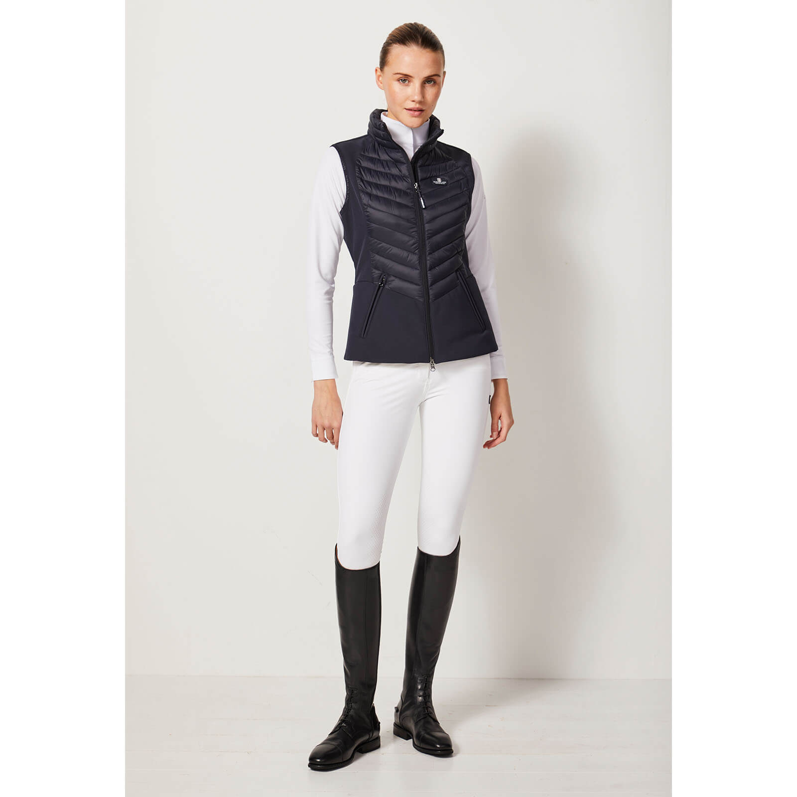 Die Weste Damen Classic Hybrid Softshell Reitweste präsentiert sich in einem zeitlosen Design, das durch feminine Nählinien und tonale Nähte betont wird. Erhältlich in den klassischen Farben Navy und Black, bietet diese Weste nicht nur einen modischen Look, sondern auch praktische Vorteile wie eine perfekte Passform, die deine Silhouette schmeichelhaft hervorhebt.