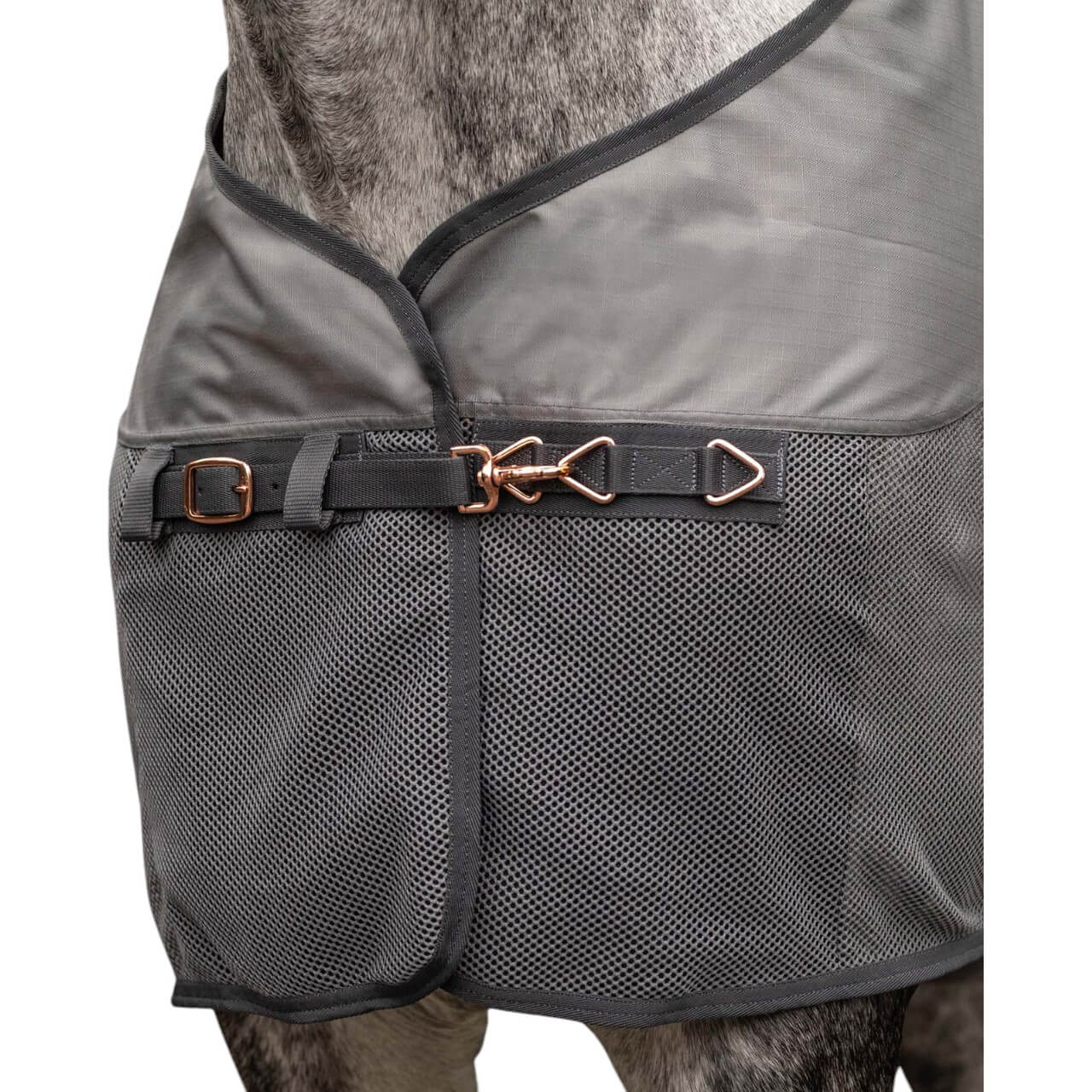Die Fliegendecke COMFORT Regendecke besticht durch ihr elegantes Design in Nachtblau oder Grau. Die dekorative Waldhausenbestickung verleiht der Decke einen stilvollen Akzent. Durch das besonders luftdurchlässige Meshgewebe wird eine optimale Luftzirkulation gewährleistet, die Hitzestau verhindert und deinem Pferd ein angenehmes Tragegefühl bietet.