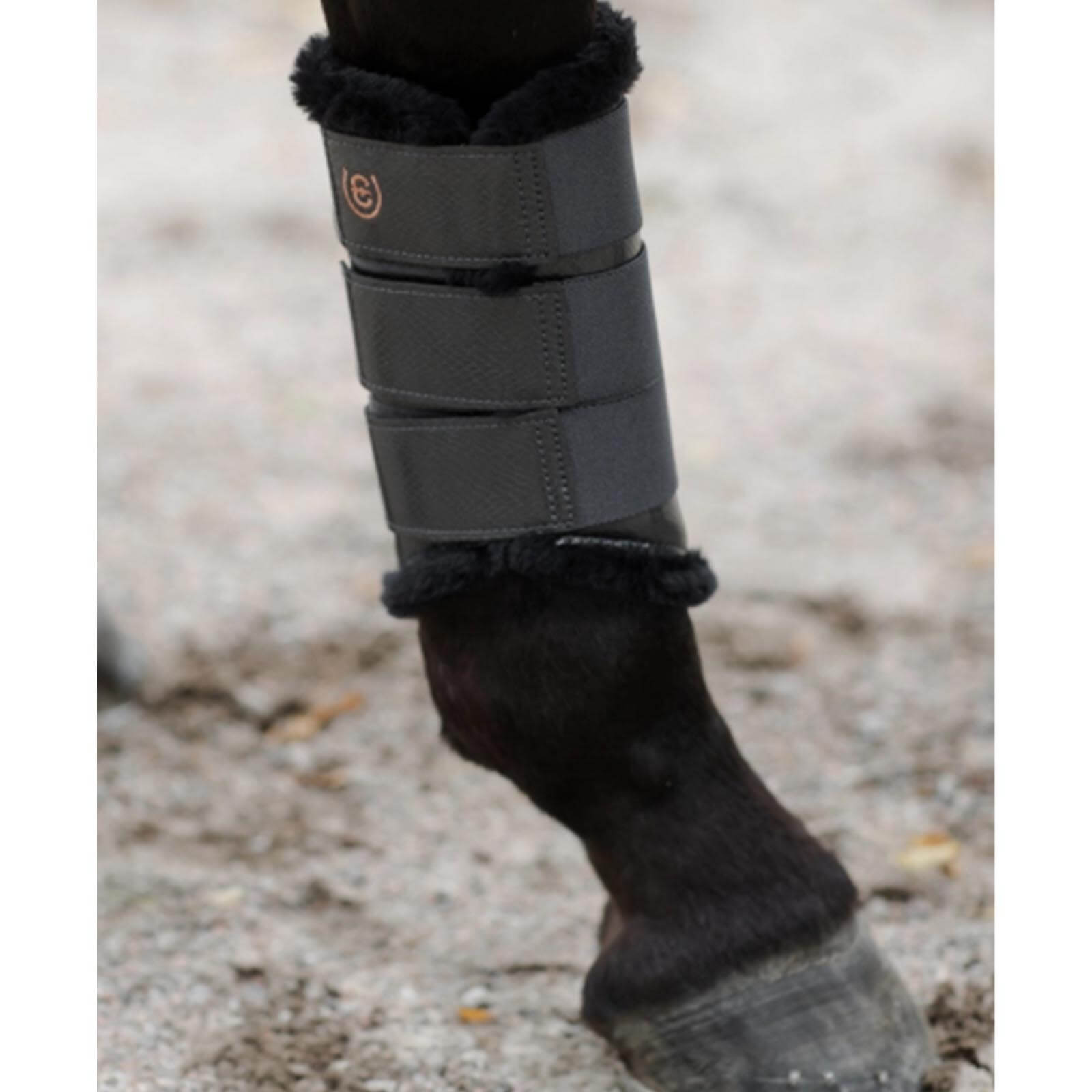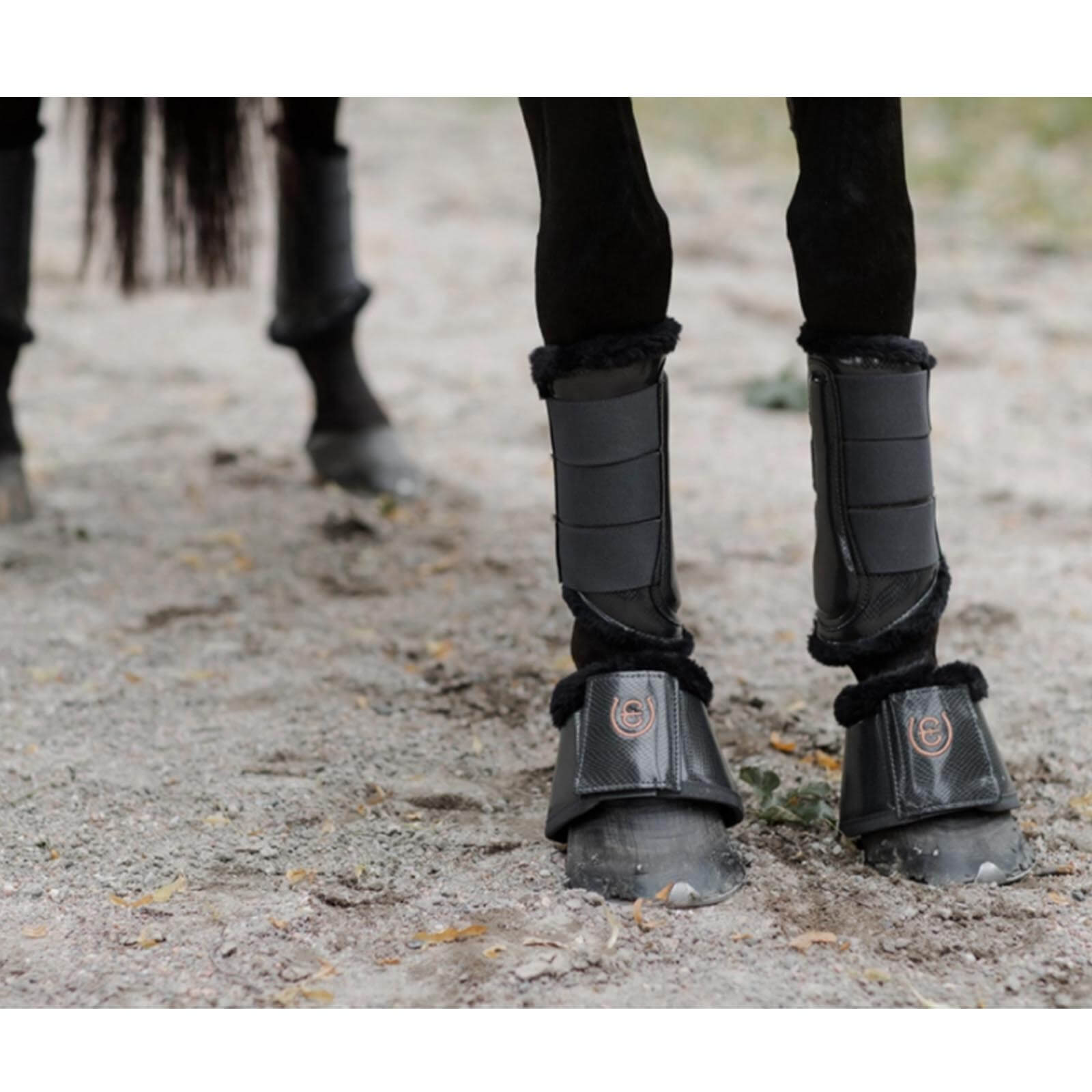 Dank der drei elastischen Klettverschlüsse mit dem Equestrian Stockholm-Logo bieten die Gamaschen Dark Sky einen sicheren Halt und lassen sich individuell anpassen. Das hochwertige Teddyfell schützt die empfindlichen Pferdebeine vor Reibung und Druckstellen, während das robuste Kunstleder für Langlebigkeit sorgt. Erlebe die Verbindung von Technik und Komfort, die dein Pferd bei jedem Schritt unterstützt.