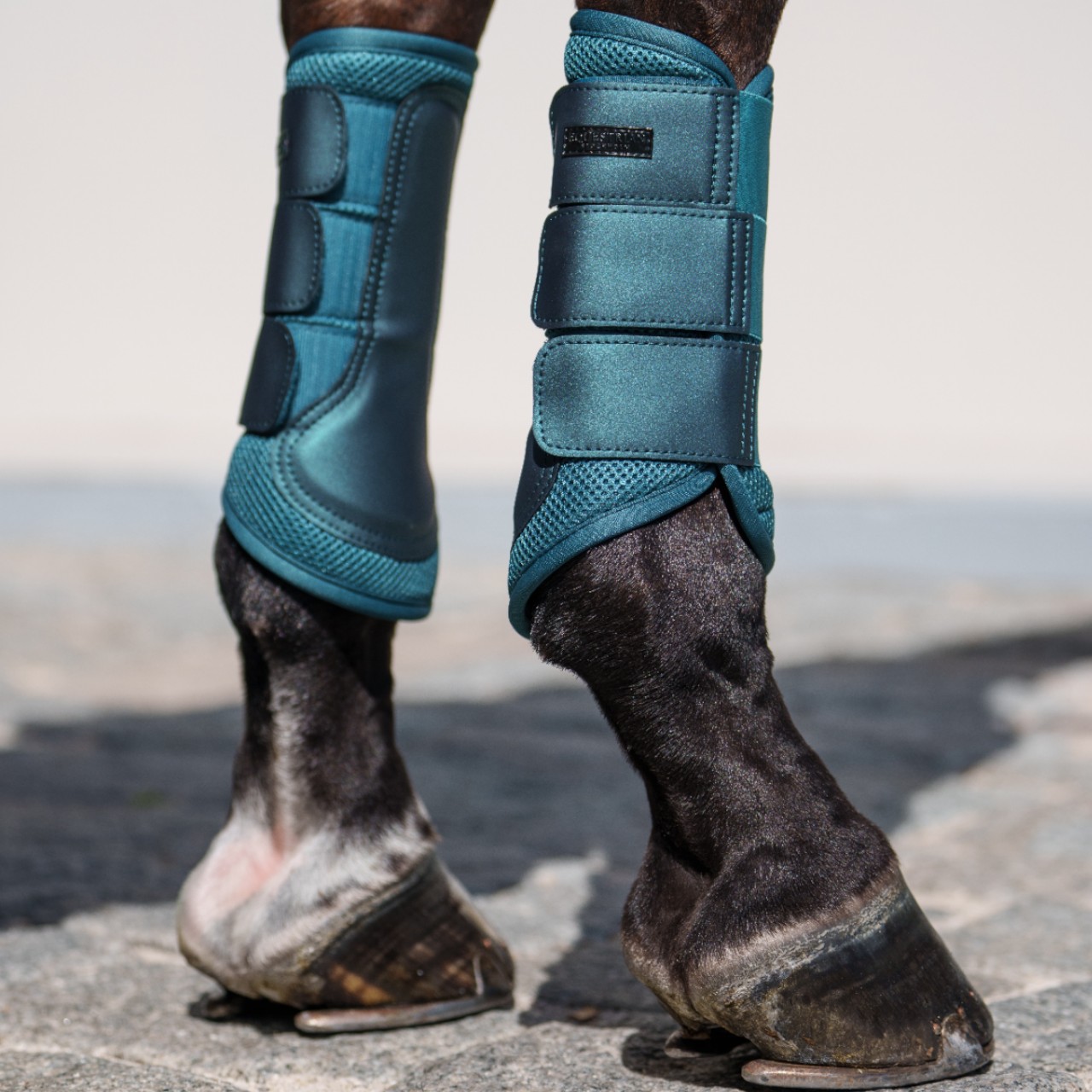Die robuste Außenseite schützt zuverlässig vor Stößen, ohne das Pferdebein zu belasten. Dabei bleiben die Gamaschen angenehm flexibel und passen sich dem Bewegungsablauf perfekt an. Das elegante Teal Blue Design mit dezenten Details unterstreicht den hochwertigen Look und fügt sich harmonisch in jede Ausrüstung ein. Die Gamaschen lassen sich einfach anlegen und mit stabilen Klettverschlüssen sicher fixieren. Durch ihre Pflegeleichtigkeit sind sie schnell wieder einsatzbereit – ideal für Reiterinnen und Reiter mit hohem Anspruch an Funktion und Ästhetik. Ob im Training oder auf dem Turnier: Diese Gamaschen bieten zuverlässigen Schutz und einen stilvollen Auftritt.