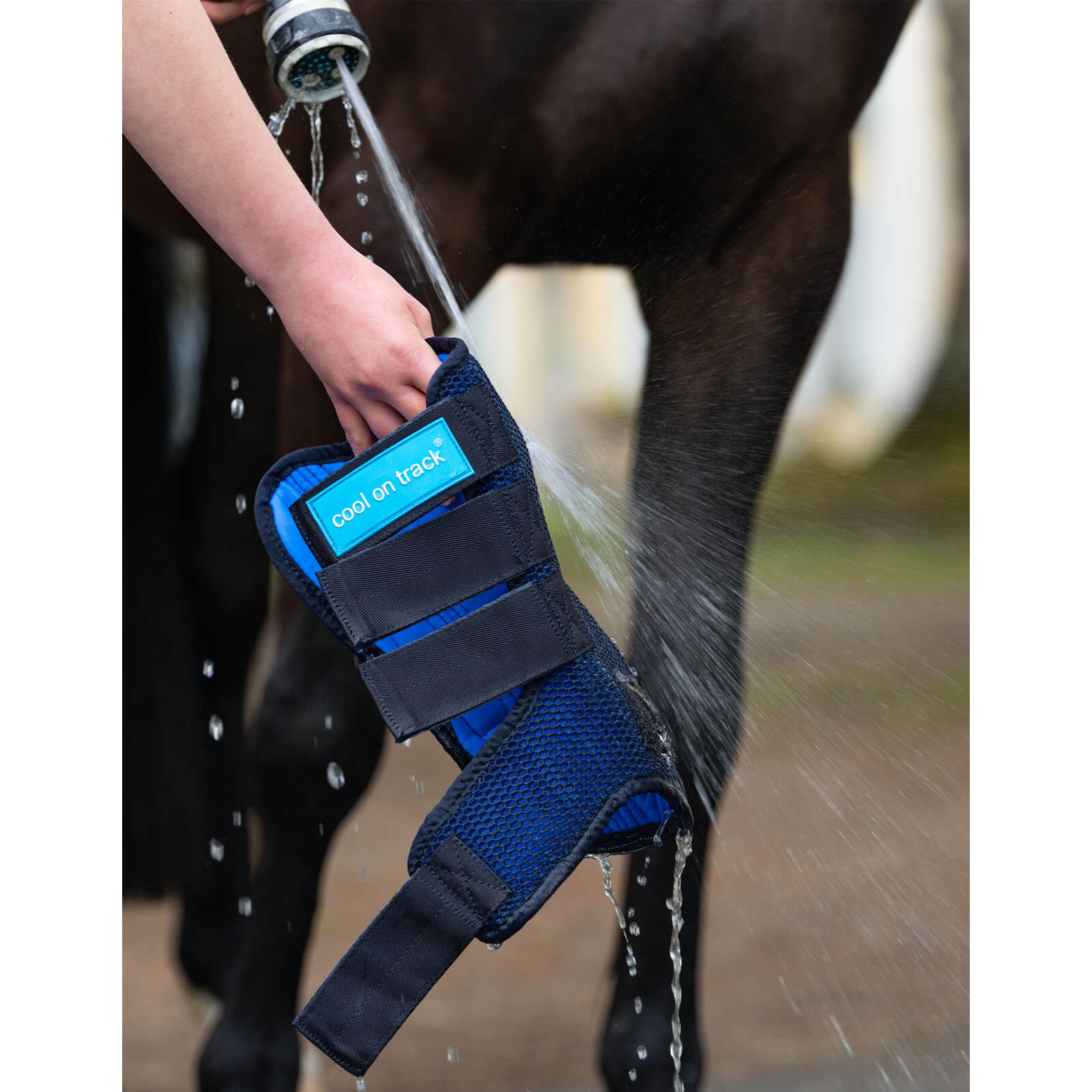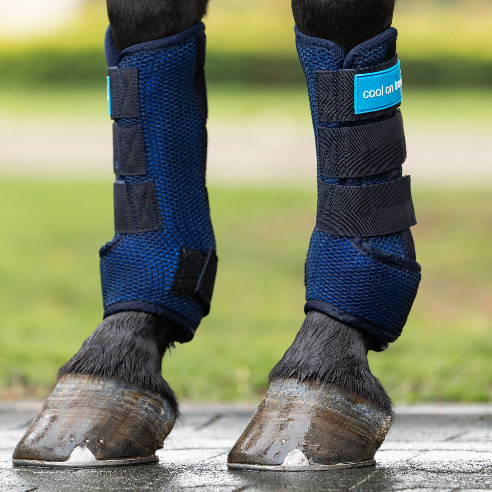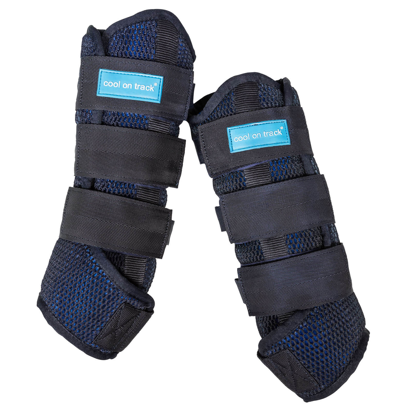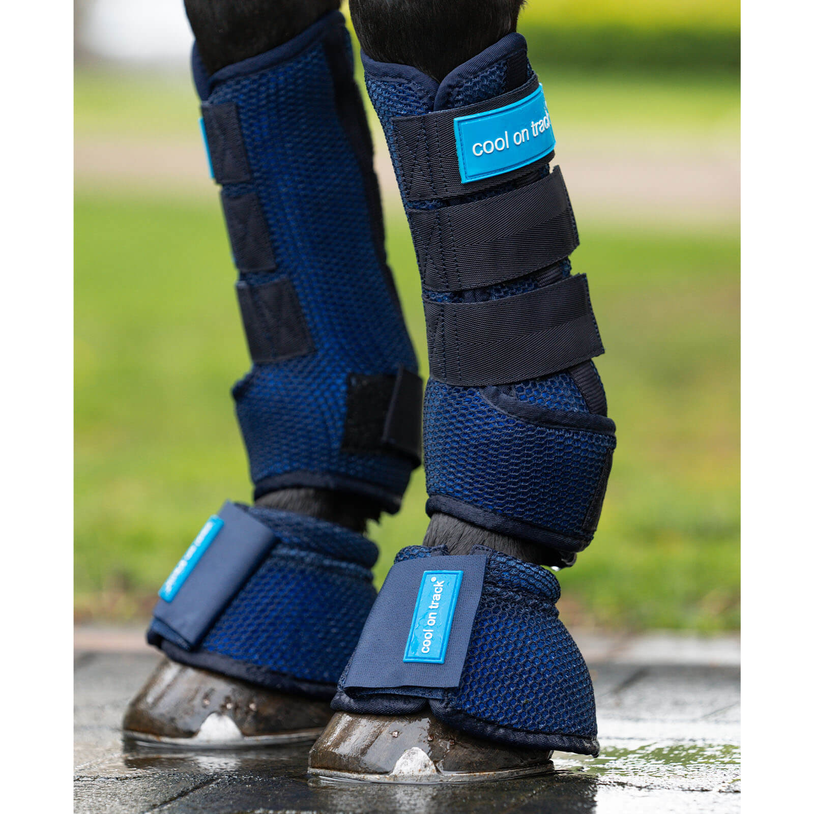 In einem ansprechenden Blau gehalten, passen sich die Cool on Track Quick Wraps stilvoll an die Beine deines Pferdes an. Die robuste Mesh-Außenhülle unterstützt die Verdunstungskühlung und sorgt für eine perfekte Passform, die sowohl Komfort als auch Stabilität bietet. Durch die Klettverschlüsse bleiben die Gamaschen sicher an Ort und Stelle.