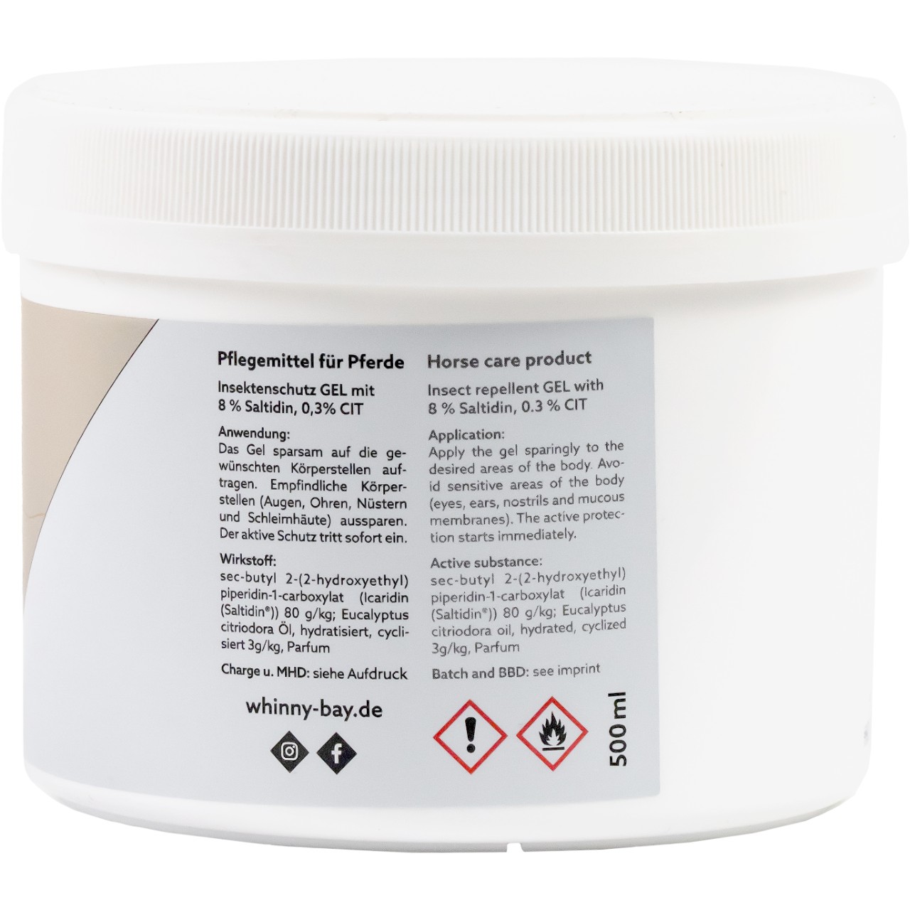 Das Insektenschutz Gel von whinny X bay enthält 8% Saltidin und 0,3% CIT. Diese Inhaltsstoffe sind sorgsam ausgewählt für eine zuverlässige Anwendung. Das Gel wird in einer handlichen 500 ml Verpackung angeboten, die einfach in der Handhabung ist und sich gut dosieren lässt.