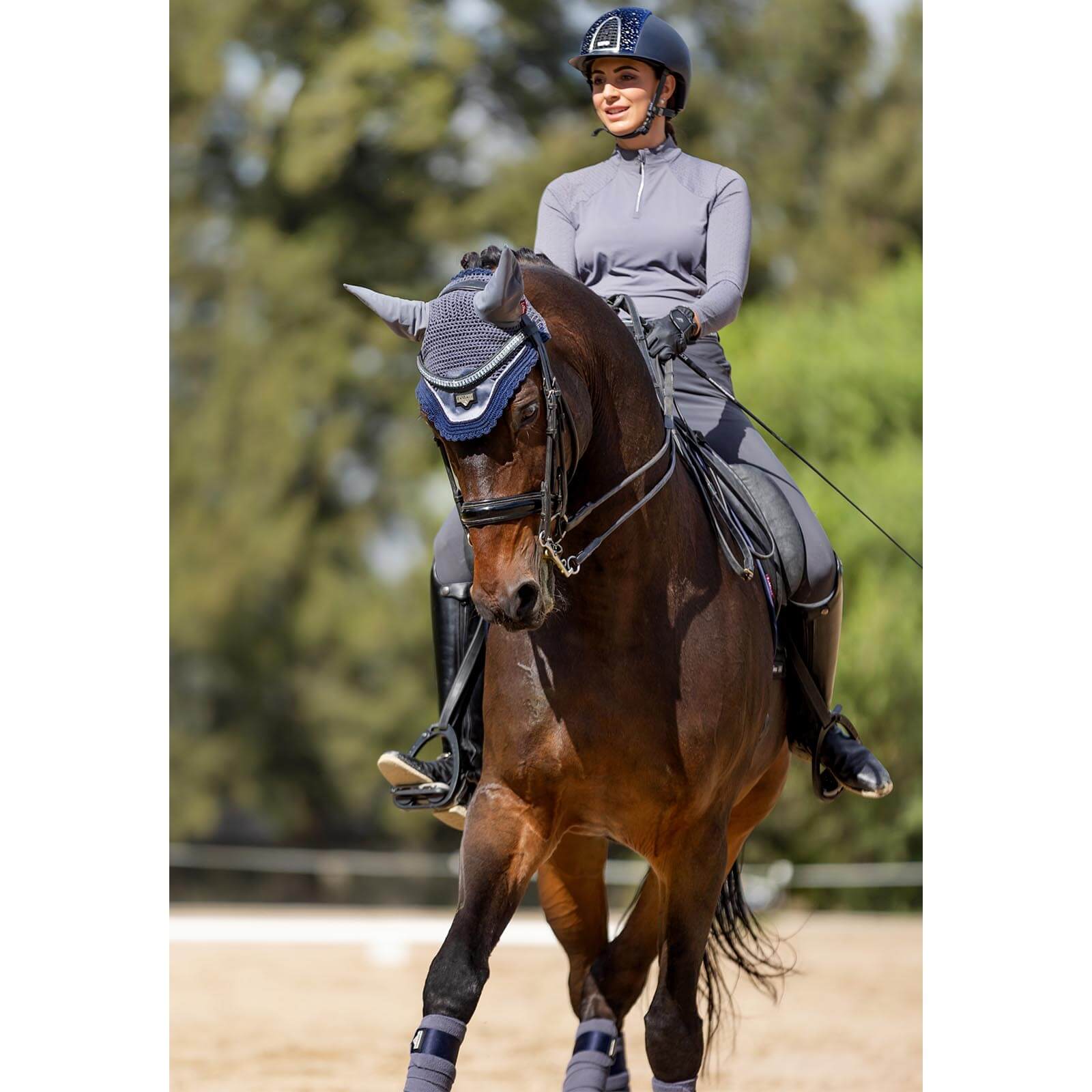 Die Fliegenmütze Loire Fly Hood Twilight besticht durch ihr edles Aussehen. Das luxuriöse Vorderteil aus Satinstoff verleiht deinem Pferd eine elegante Ausstrahlung, während der 3-Wege-Handstrick für eine perfekte Passform sorgt. Diese Kombination aus Ästhetik und Funktion macht die Mütze zu einem bevorzugten Accessoire auf jedem Turnier.