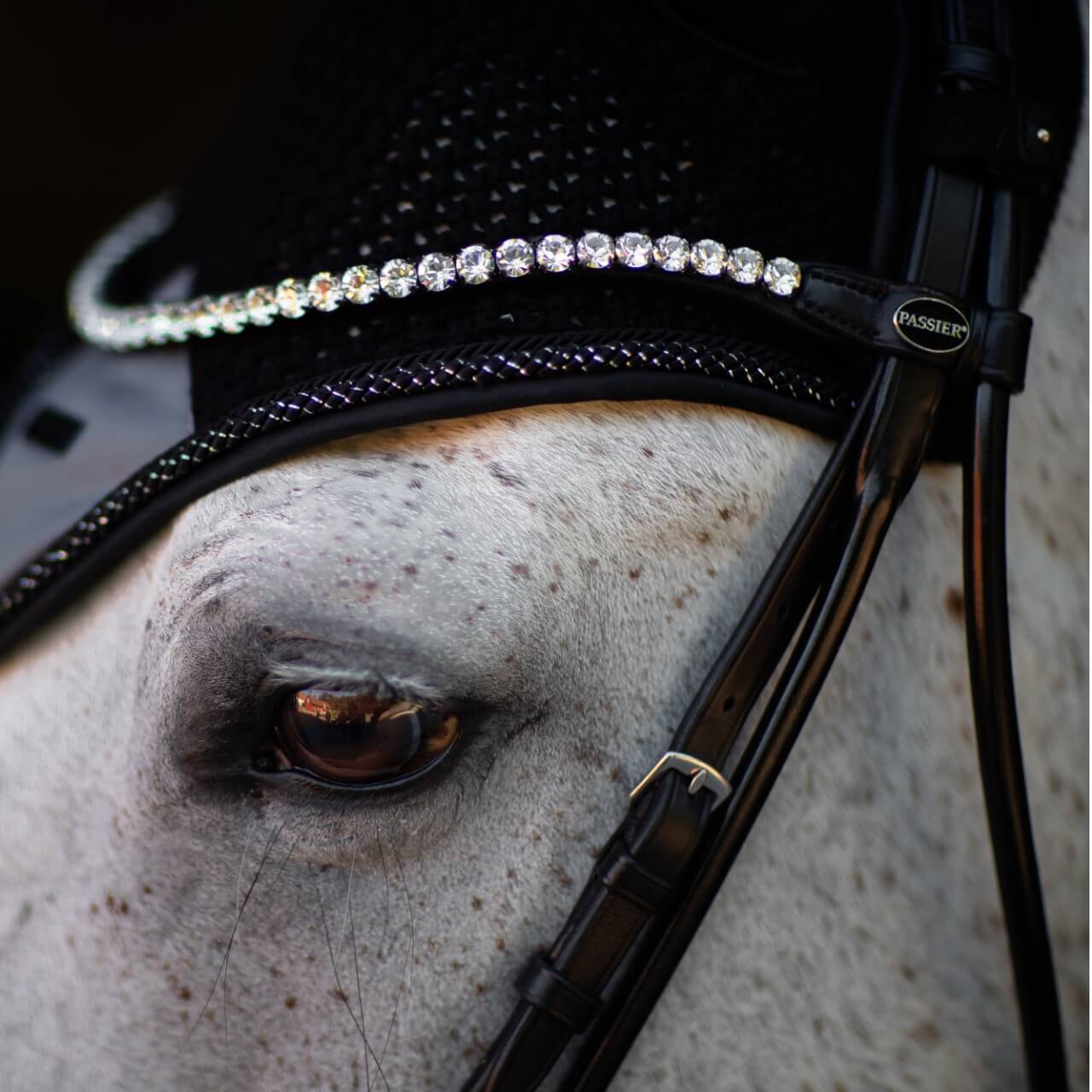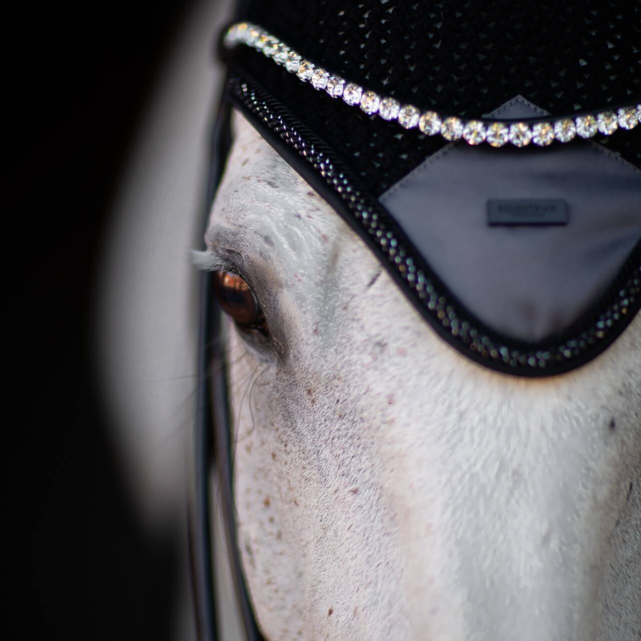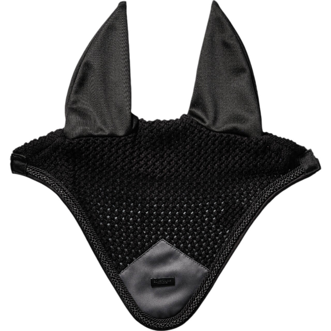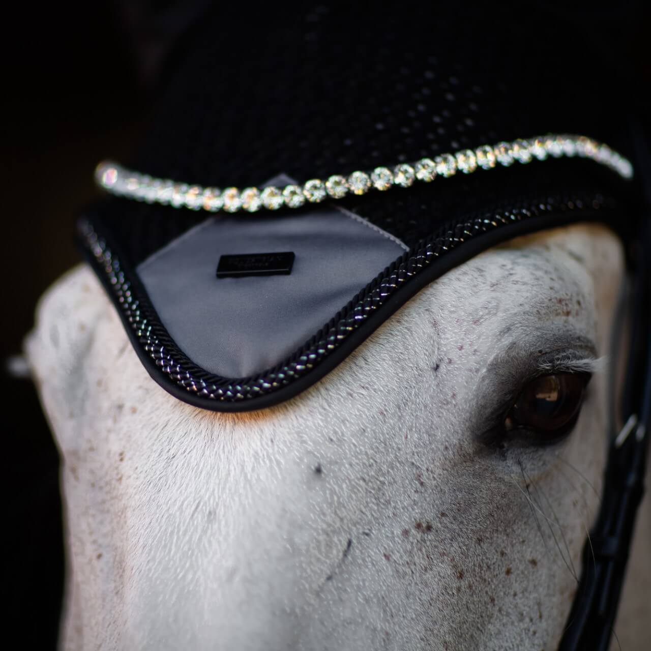Das markante Design der Fliegenmütze Winter Shadow beeindruckt mit einem stilvollen, schwarzen Look, der durch einen Ton-in-Ton-Satin-Aufnäher und eine feine Paspelierung mit Silberfaden veredelt wird. Diese edlen Details verleihen deinem Pferd einen souveränen Auftritt und bieten gleichzeitig praktischen Schutz vor Insekten.