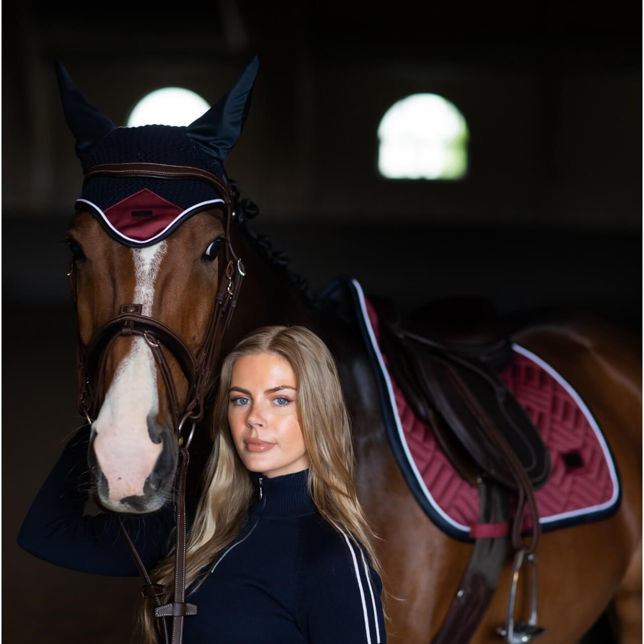Die Fliegenmütze Modern Luxe besticht durch ihre elegante Farbgebung in Navy, Schwarz und Cold Deep Red. Das glänzende Material aus 100 % Polyester verleiht der Mütze einen luxuriösen Touch, während die schwarze Metallplakette und das kühle Tiefrot als stilvolle Akzente hervorstechen. Dieses dezente Design passt sich jeder Trense perfekt an und verleiht deinem Pferd einen modernen und ansprechenden Look.