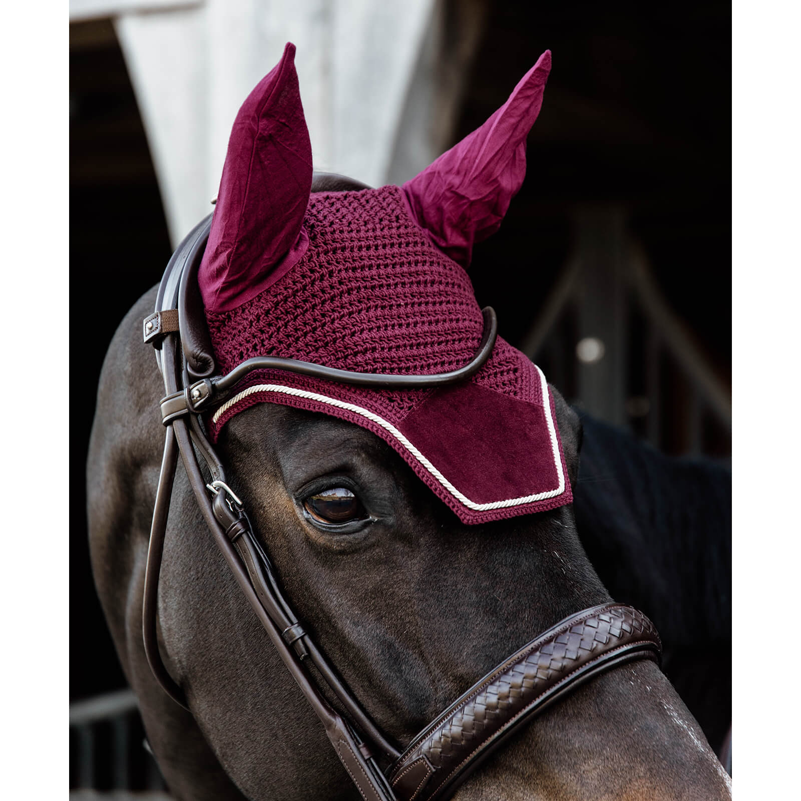 Die Fliegenmütze Wellington Velvet besticht durch ihren eleganten Look, der durch velvet details veredelt wird. Verfügbar in verschiedenen Farben wie Lila, Rot und Bordeaux, passt sie perfekt zu jedem Outfit deines Pferdes. Das schmal geschnittene, dehnbare Material um die Ohren sorgt für eine bequeme Passform und schützt effektiv vor Fliegen.