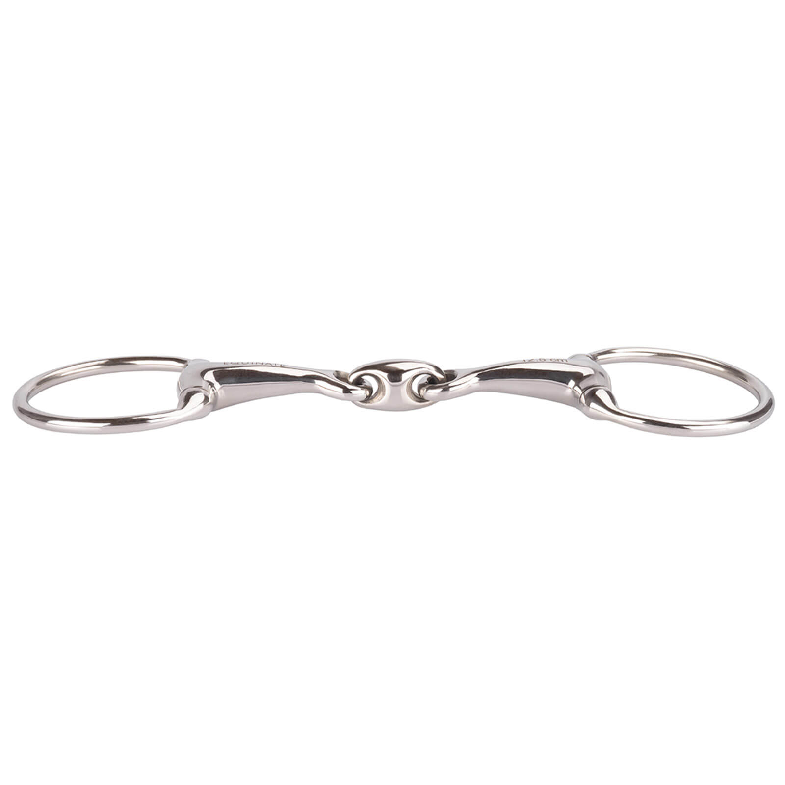 Das doppelt gebrochene Mundstück des Gebisses vermeidet den unerwünschten Nussknacker-Effekt und verteilt den Druck gleichmäßig auf Zunge und Laden. Diese Technologie ermöglicht eine sanfte, aber effektive Kommunikation und fördert die Anlehnung deines Pferdes. Die seitliche Unterstützung durch die Olivenkopfringe verbessert die Führung in Wendungen erheblich.