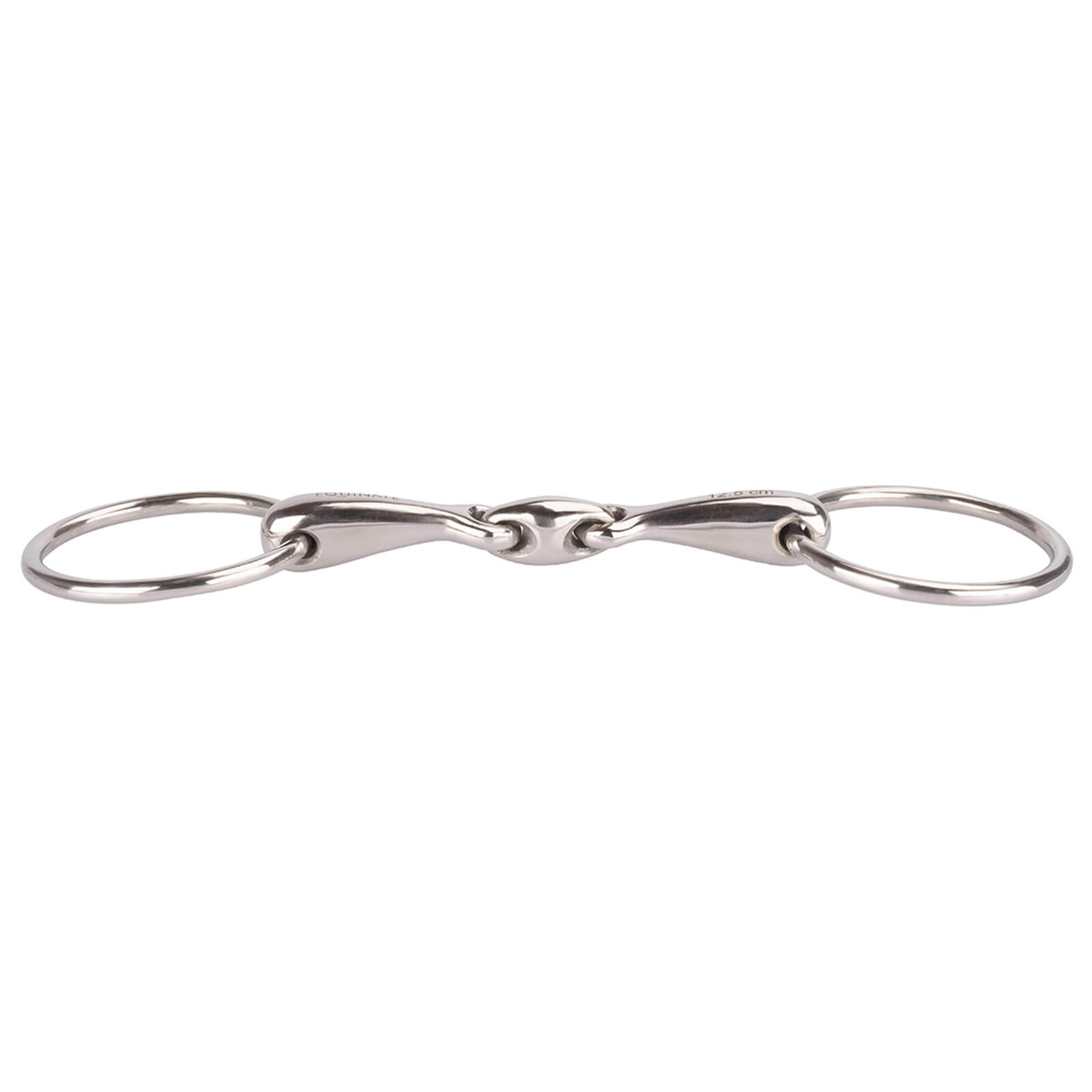 Die doppelt gebrochene Struktur dieser Wassertrense verhindert den unerwünschten Nussknacker-Effekt und verteilt den Druck gleichmäßig auf Zunge und Laden. Dies ermöglicht eine präzise und maulschonende Einwirkung, die das Vertrauen deines Pferdes in deine Hand stärkt.