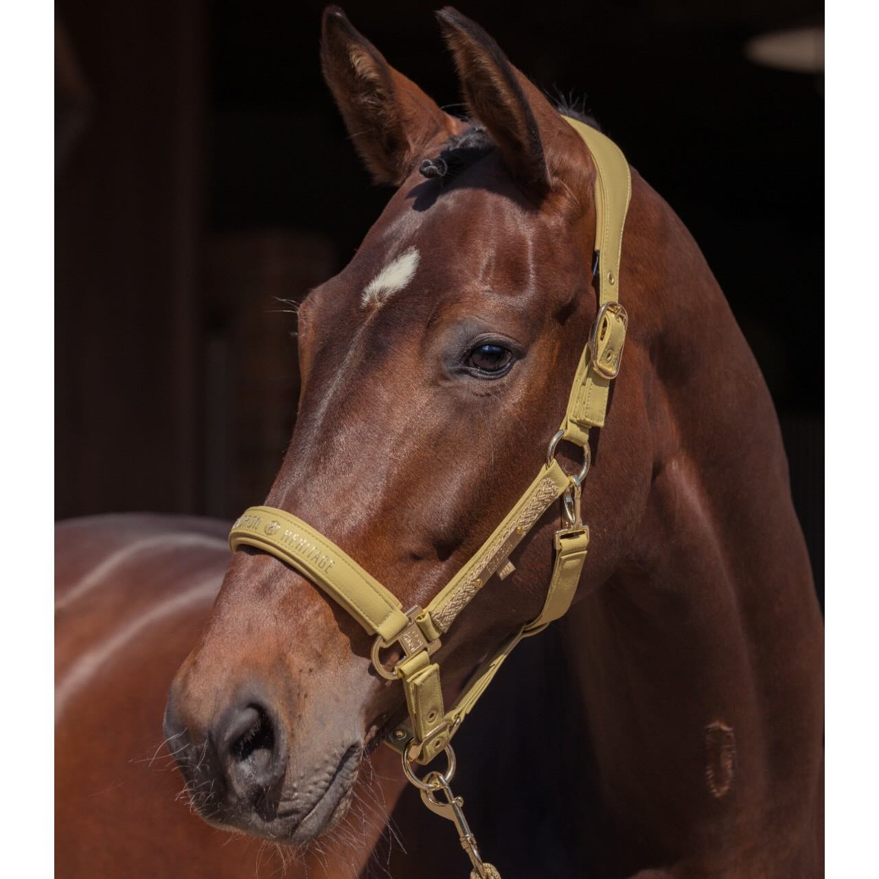 Dank der beidseitigen Dornschnallen lässt sich das Halfter individuell an den Pferdekopf anpassen. Diese durchdachte Konstruktion ermöglicht eine symmetrische Einstellung und sorgt für sicheren Sitz. Der Kinnriemen ist zusätzlich verstellbar, wodurch Druckstellen vermieden werden. Goldene Metallbeschläge setzen elegante Akzente und harmonieren perfekt mit dem Heritage-Design. Der Metallic-Schriftzug auf dem Nasenband unterstreicht den edlen Charakter des Halfters. So vereint das Modell Komfort, Stil und Funktion in einem durchdachten Produkt.