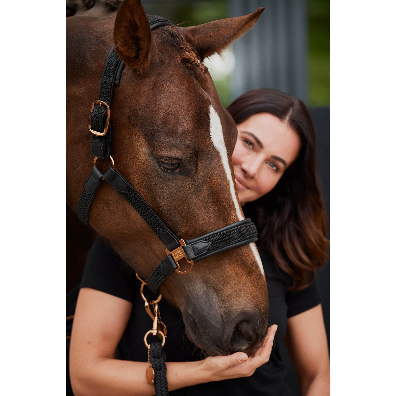 Das Halfter beeindruckt durch seine edle Optik mit geflochtenem Nylon und kupferfarbenen Beschlägen. Diese hochwertigen Details verleihen dem Halfter nicht nur ein luxuriöses Aussehen, sondern sind auch äußerst robust und langlebig. Die dezente Farbpalette in Black, Cognac und Powder Blue bietet dir die Möglichkeit, das perfekte Modell für deinen Liebling zu finden.