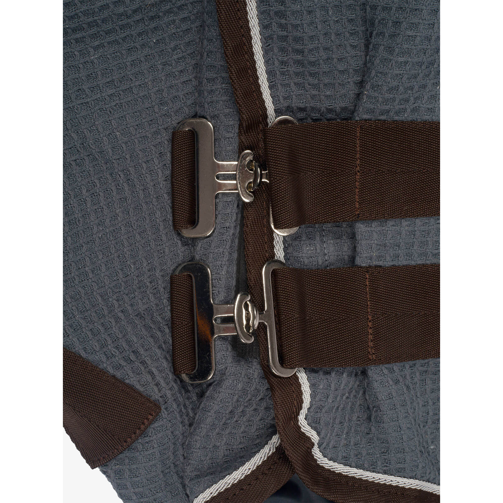 Die Abschwitzdecke besticht durch ihre attraktive Storm Blue Farbe und die stilvolle Logostickerei in einem warmen Honigton. Diese dekorativen Details verleihen der Decke eine edle Optik, während die silbernen Metall-T-Schnallen für eine sichere und einfache Handhabung sorgen.