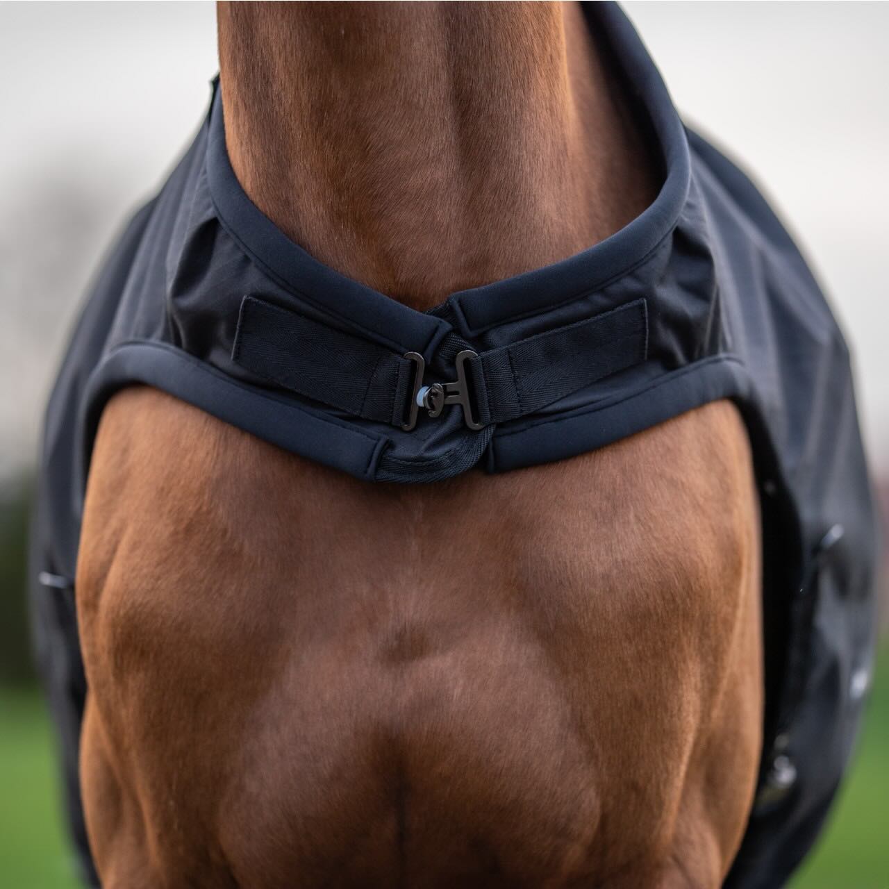 Besonders praktisch ist die Kompatibilität mit zusätzlichen Halsteilen und Linern, die sich dank des integrierten Klettsystems einfach befestigen lassen. Dadurch kannst du die Decke individuell an die Bedürfnisse deines Pferdes und die jeweilige Wetterlage anpassen. Das macht sie zu einem echten Allrounder für die gesamte Deckensaison. Mit T-Verschluss und Klett vorne ist ein schnelles An- und Ausziehen möglich. Eine längeneinstellbare Kreuzbegurtung sowie die tiefe Hinterhandkordel sorgen für sicheren Halt. Damit genießt dein Pferd uneingeschränkten Komfort bei jeder Bewegung.