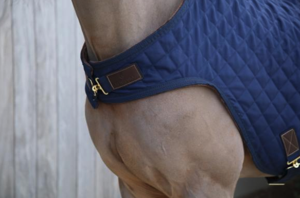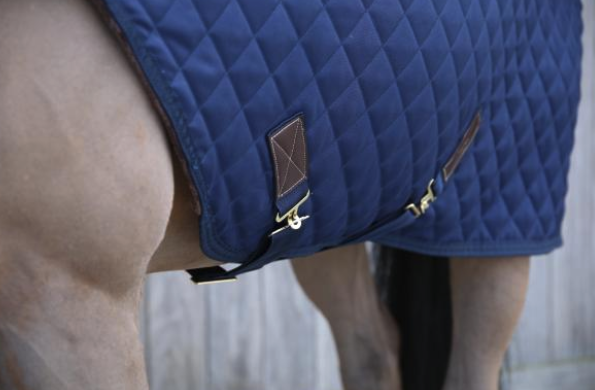Die Führanlagendecke besticht durch ihre elegante Diamantensteppung und klassische Details aus braunem Lederimitat. Diese Kombination verleiht der Decke nicht nur einen schicken Look, sondern sorgt auch für eine stabile Passform. Das edle Marineblau fügt sich harmonisch in jeden Stall ein und unterstreicht den hochwertigen Charakter der Walker Rug.