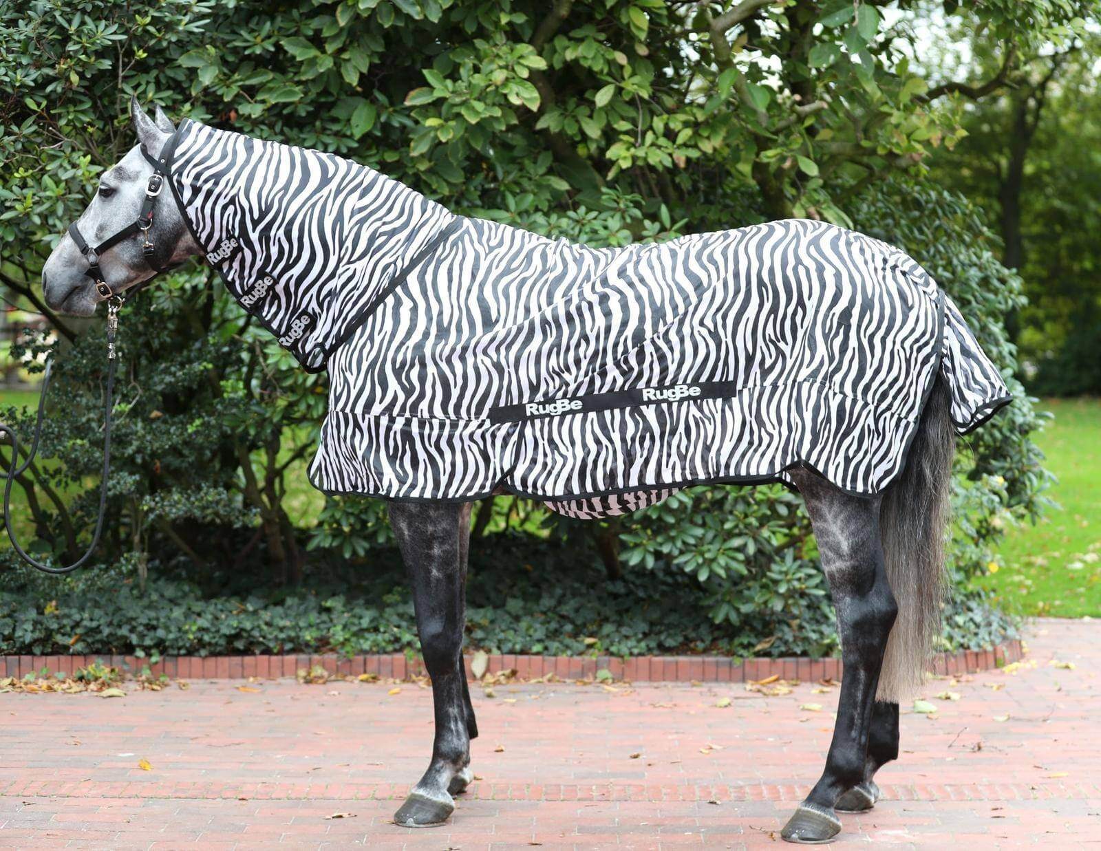 Fliegendecke RugBe Zebra mit Halsteil – Schutz in stilvollem Zebra-Look