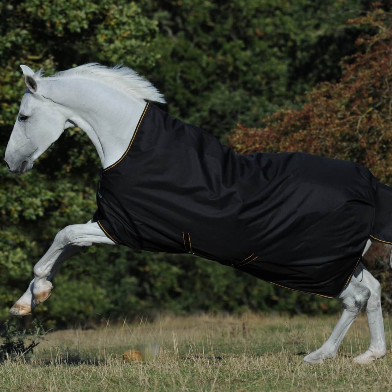 Die Outdoordecke 300g Irish Turnout 300 besticht durch ihr stilvolles Erscheinungsbild in Navy/Gold und Black/Gold. Diese Farbkombinationen verleihen deinem Pferd einen edlen Look, während das 1200 Denier Ripstop-Außenmaterial für Langlebigkeit sorgt. Die durchdachte Gestaltung mit Schulterfalten ermöglicht uneingeschränkte Bewegungsfreiheit, ideal für aktive Pferde.