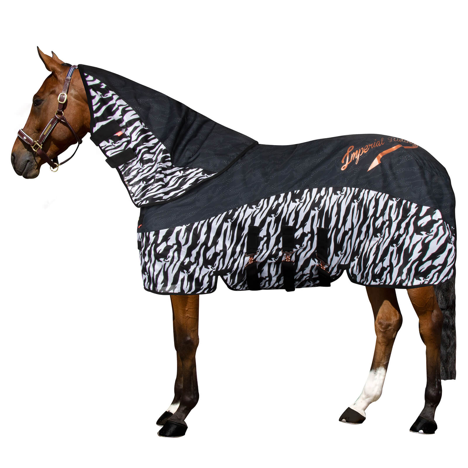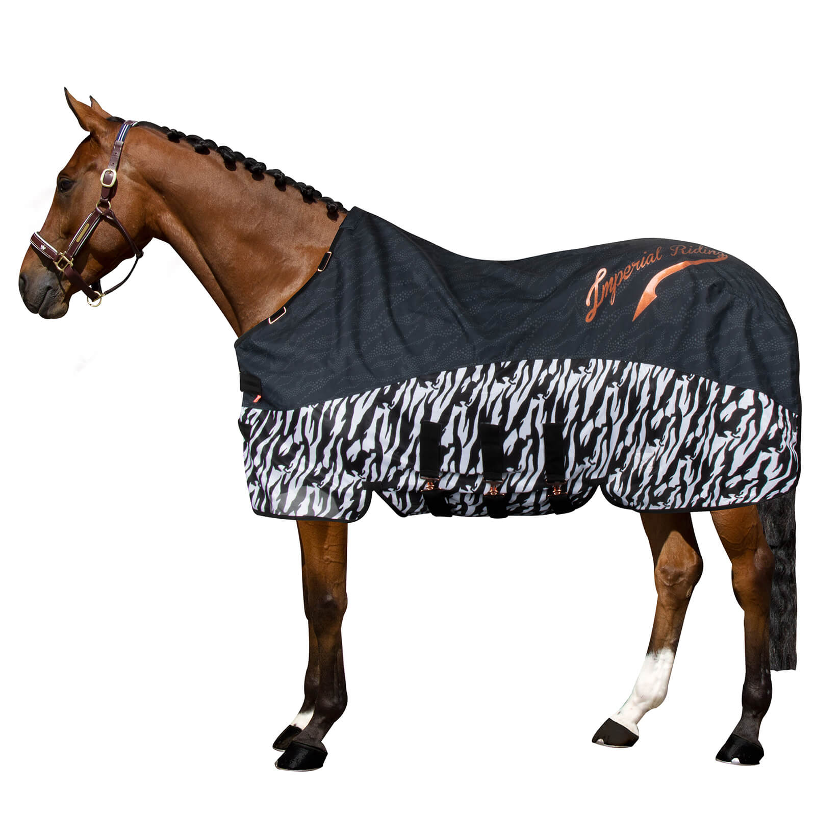 Die Decke Rain & Fly IRHSuper-dry Carly Classic besticht durch ihr modernes Black Zebra und Navy Bloom Design, das nicht nur optisch ansprechend ist, sondern auch hohe Sichtbarkeit auf der Weide gewährleistet. Die Kombination aus wasserdichtem 600D Oxford-Material und feinem Mesh sorgt dafür, dass dein Pferd trocken bleibt und gleichzeitig optimal belüftet wird.