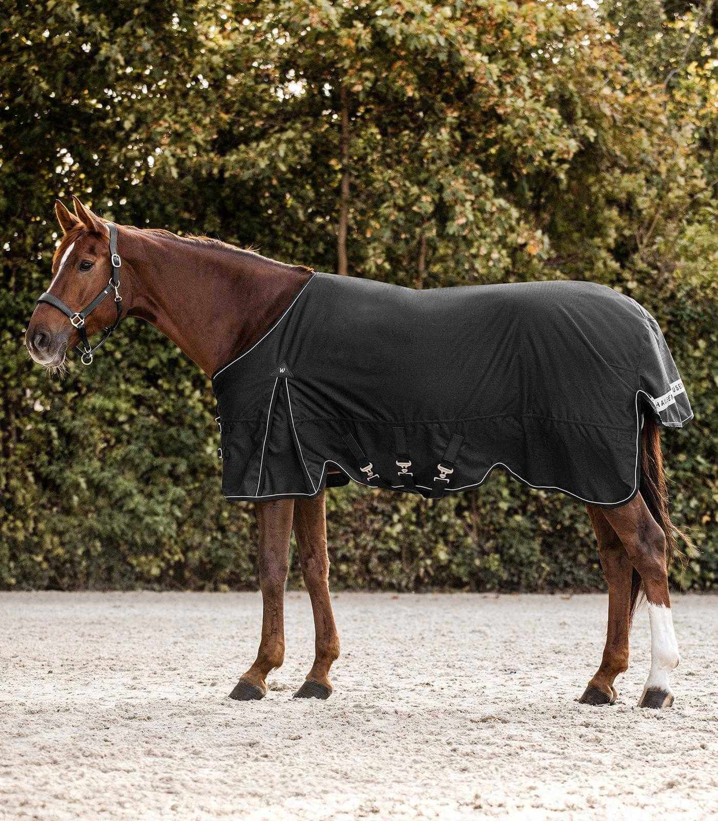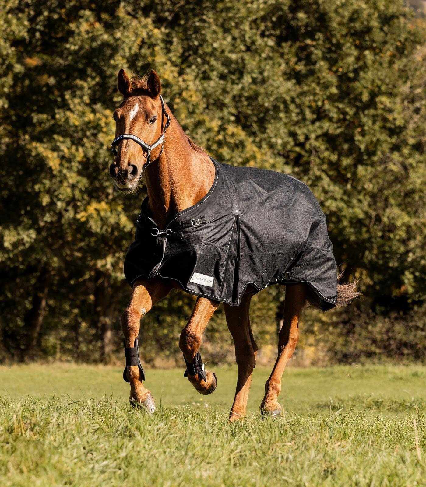 Die Outdoordecke Scandic, Light beeindruckt durch ihr elegantes Erscheinungsbild in klassischem Schwarz oder Nachtblau. Die reflektierenden Elemente sorgen nicht nur für eine moderne Optik, sondern erhöhen auch die Sichtbarkeit bei schlechten Lichtverhältnissen – ein entscheidender Sicherheitsaspekt. Die durchdachte Passform mit extra großer Gehfalte bietet deinem Pferd maximale Bewegungsfreiheit.