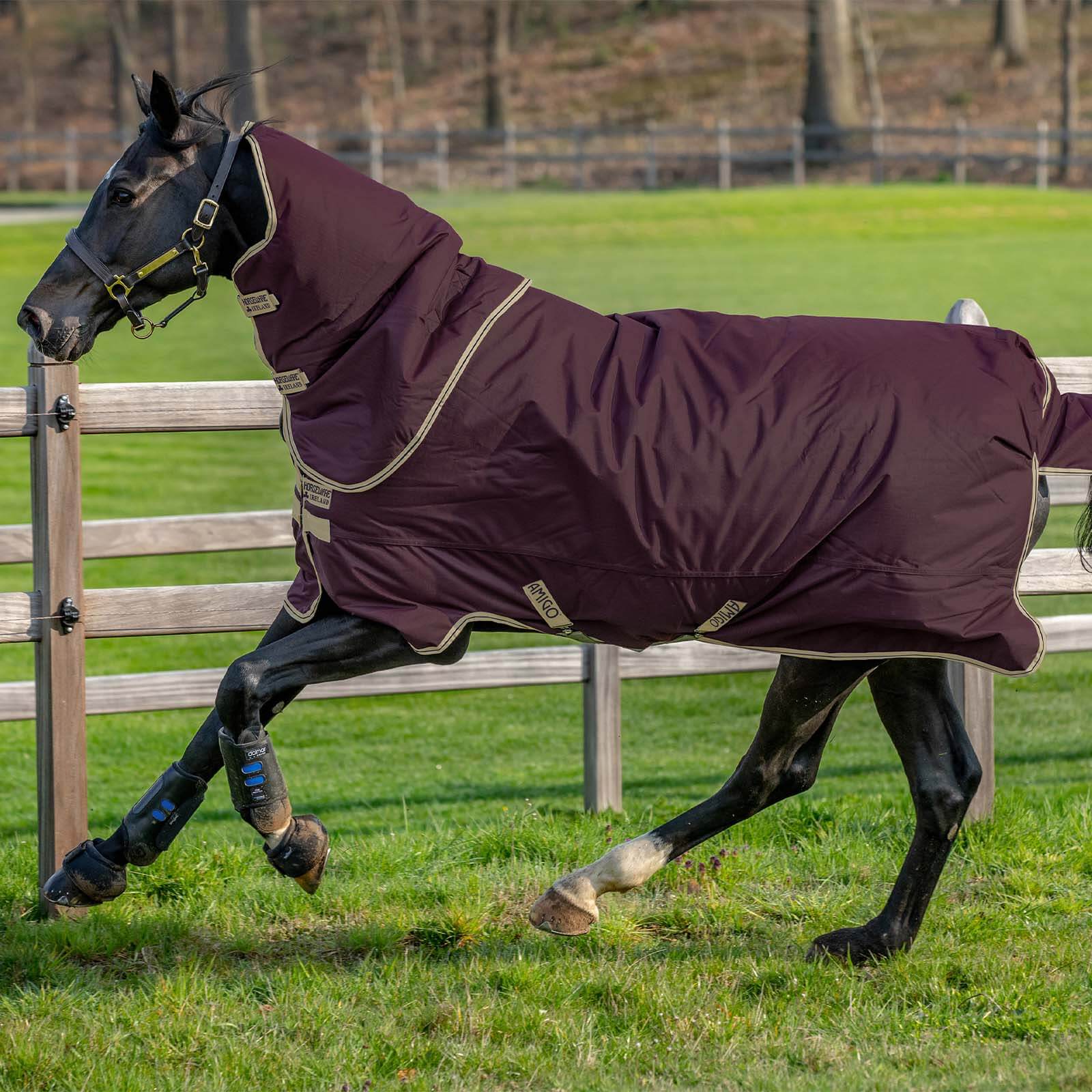 Die Amigo Hero Ripstop Plus Lite besticht durch ihre stilvolle Farbgebung in Fig/Navy & Tan sowie Print/Burgundy & White. Diese Outdoordecke kombiniert Ästhetik und Funktion, indem sie einen klassischen Look mit praktischen Elementen wie dem doppelten Vorderverschluss vereint. Einzigartige Beinausschnitte unterstützen die Bewegungsfreiheit deines Pferdes, während die Halsteilschlaufen für zusätzlichen Komfort sorgen.
