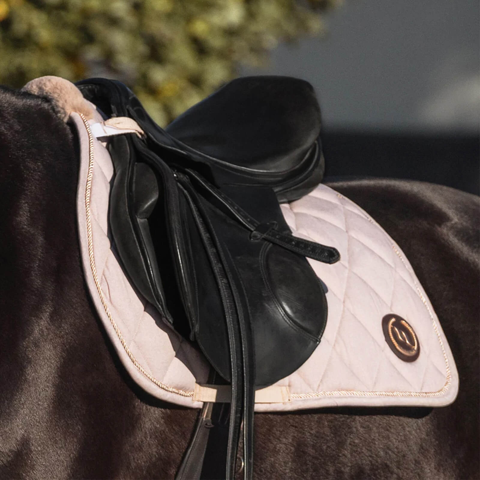 Die Schabracke überzeugt durch ihr edles Design in Light Beige, das jedem Dressurpferd einen stilvollen Auftritt garantiert. Die harmonische Farbgebung in Kombination mit der kontrastreichen schwarz/rosegold Variante hebt sich optisch hervor und verleiht deinem Pferd ein einzigartiges Erscheinungsbild. Die anatomische Passform sorgt nicht nur für eine ästhetische Optik, sondern bietet auch einen optimalen Sitz.