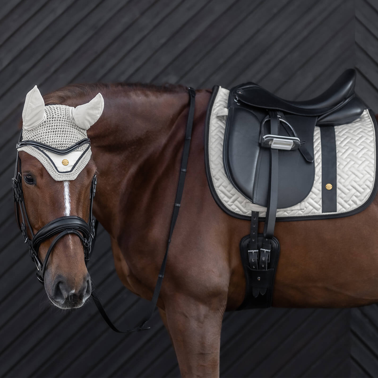 Die Schabracke Madrid besticht durch ihr edles Erscheinungsbild in der zeitlosen Farbe Sand. Das Fischgrätmuster verleiht der Schabracke nicht nur eine ansprechende Optik, sondern sorgt auch für eine ideale Druckverteilung. Der stilvolle Lederimitat-Streifen und die goldenen Metallplättchen setzen elegante Akzente und machen sie zu einem echten Hingucker in jeder Reitstunde.