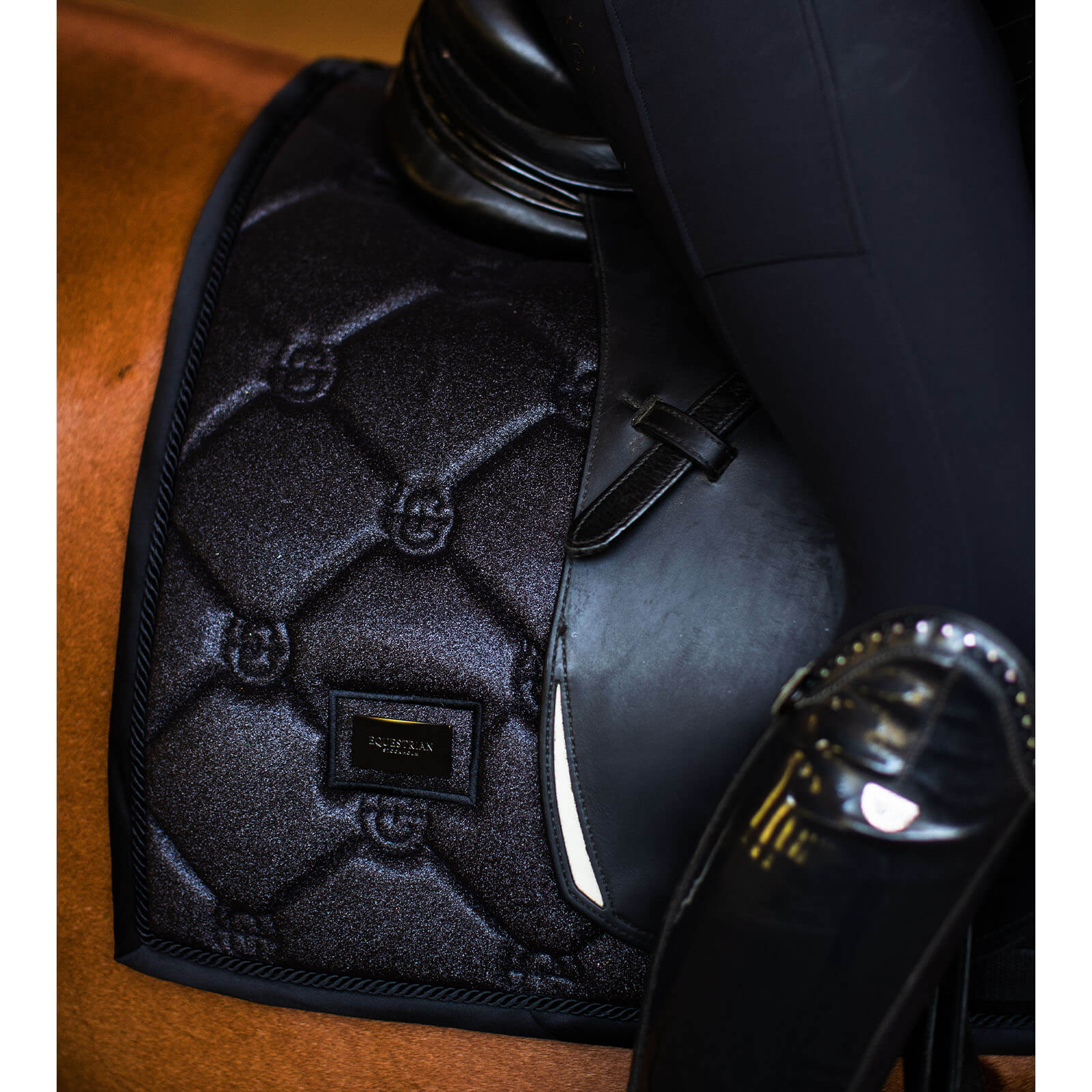 Schabracke All Black Glimmer Dressurschabracke von Equestrian Stockholm bringt Eleganz in dein Training. Diese Dressurschabracke besticht durch ihr schimmerndes schwarzes Glitzerdesign, kombiniert mit funktionalen Vorteilen wie Atmungsaktivität und Strapazierfähigkeit, die dein Pferd optimal unterstützen.