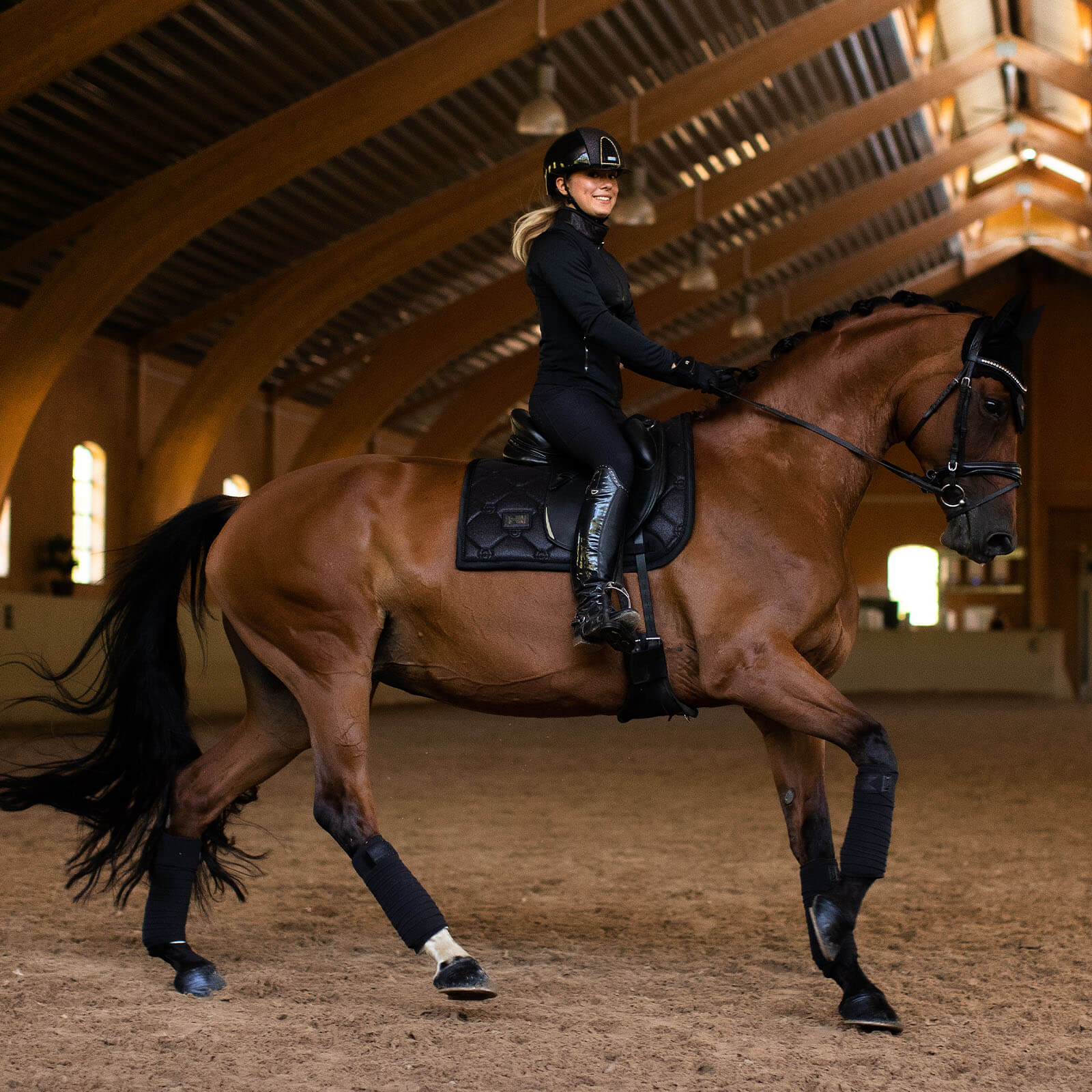 Ob im täglichen Training oder bei Turnieren – die Schabracke All Black Glimmer Dressurschabracke ist vielseitig einsetzbar. Pflege sie durch Maschinenwäsche bei 30°C und vermeide Bleichmittel sowie Weichspüler, um ihre Qualität zu erhalten. Vertraue auf Equestrian Stockholm und gönne deinem Pferd den besten Schutz und Komfort.