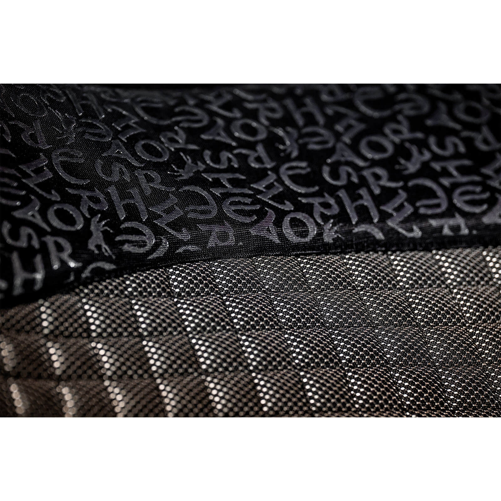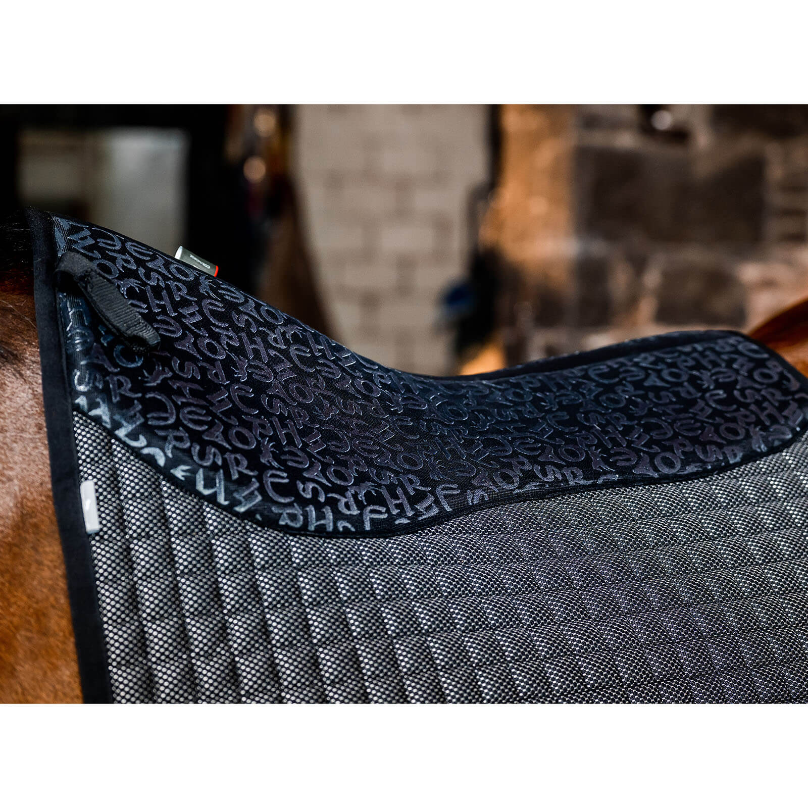 Das Design der Tech Comfort Schabracke besticht durch klare Linien und eine ansprechende Optik in zeitlosem Schwarz und Weiß. Der konturierte Schnitt sorgt nicht nur für eine elegante Silhouette, sondern passt sich auch nahtlos an den Rücken deines Pferdes an. Der verstärkte Bereich an der Oberseite bietet zusätzliche Stabilität und dient als integriertes Sattelpad, das durch das Anti-Rutsch-Design einen sicheren Sitz gewährleistet.