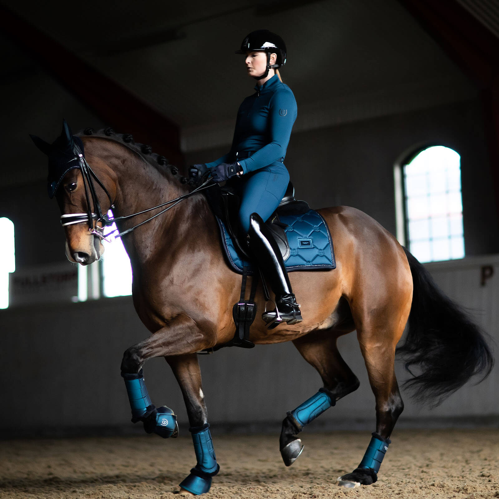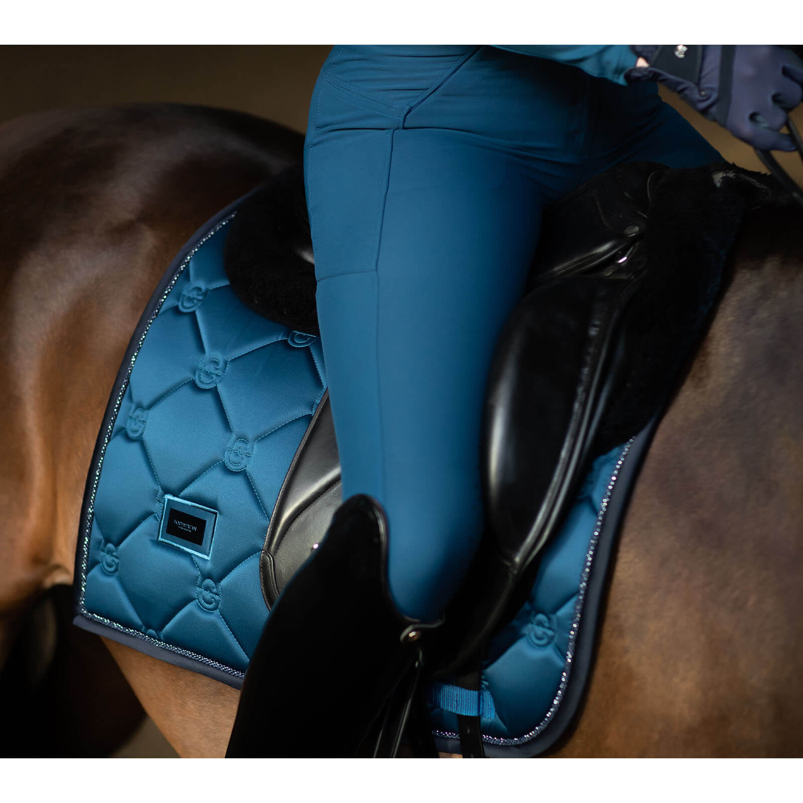 Die Schabracke begeistert durch ihre marineblaue Farbgebung, die durch blaue Metallic-Details perfekt akzentuiert wird. Das edle Design sorgt nicht nur für einen stilvollen Auftritt, sondern bietet auch praktische Vorteile wie eine optimale Passform, die ein Verrutschen verhindert. Die geschwungene Form harmoniert perfekt mit deinem Dressursattel und betont die Silhouette deines Pferdes.