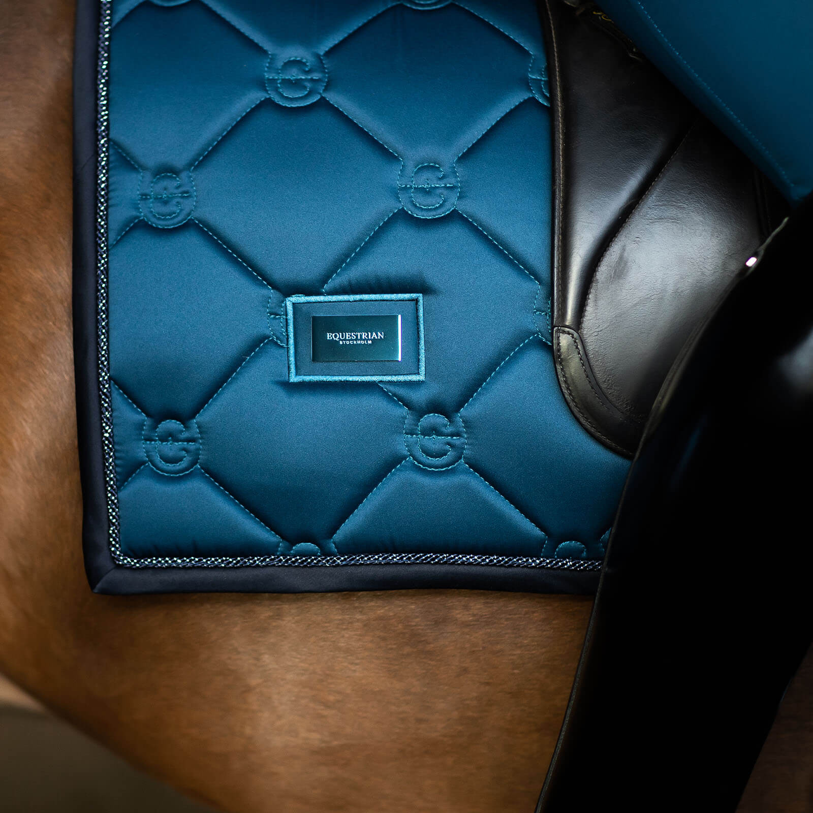 Schabracke Dressur Blue Meadow FS 2023 Dressurschabracke von Equestrian Stockholm bringt Stil und Technik in Einklang. Mit ihrer eleganten marineblauen Farbe und den glänzenden Metallic-Details ist sie der Hingucker in jeder Dressurprüfung. Die Kombination aus ästhetischem Design und herausragenden Materialeigenschaften macht sie zum unverzichtbaren Begleiter für ambitionierte Reiter.