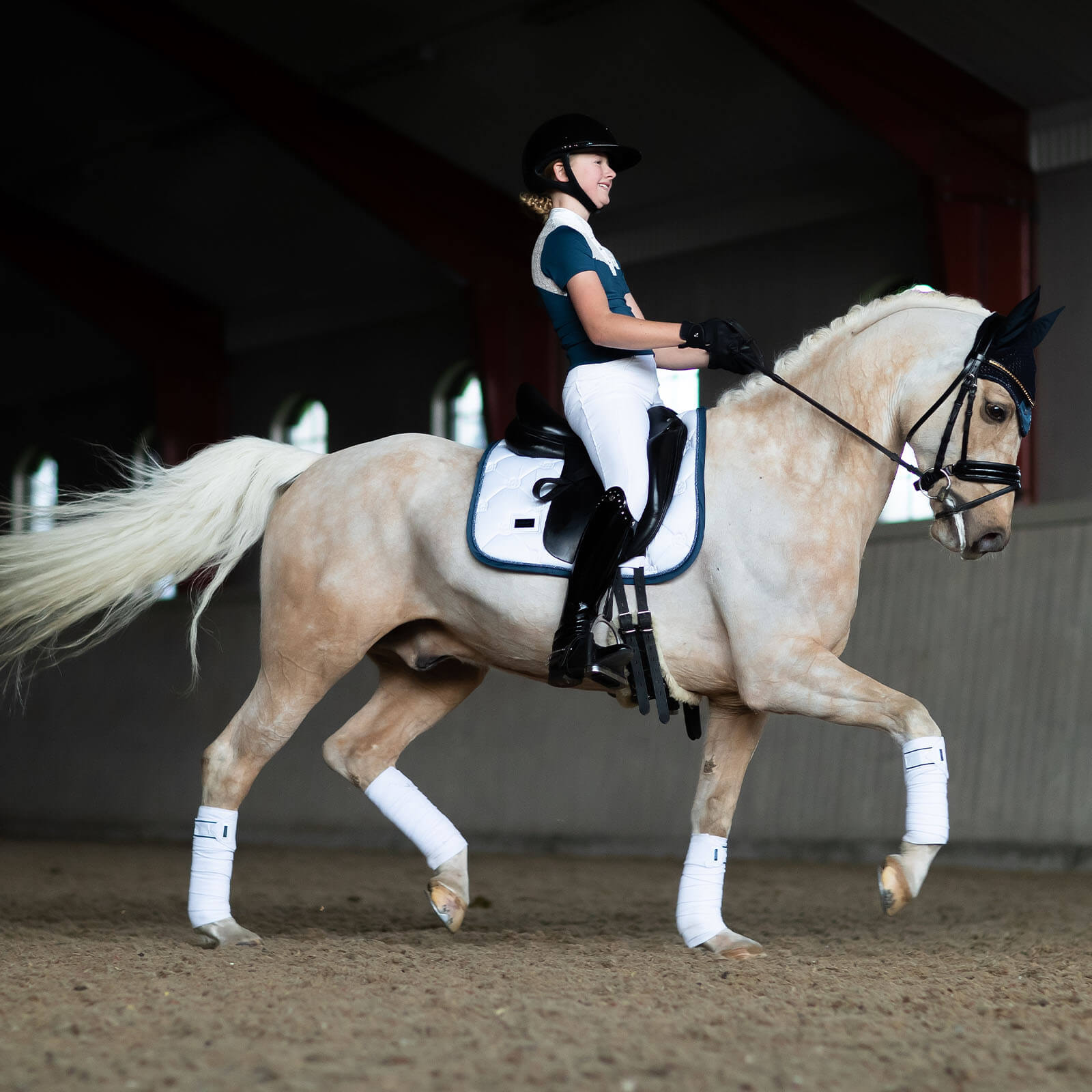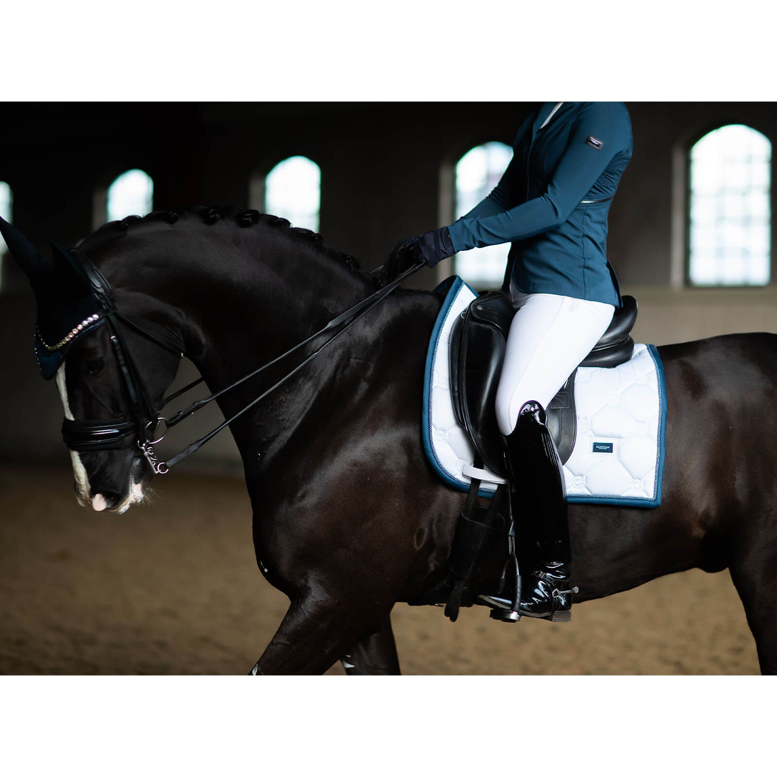 Schabracke Dressur White Blue Meadow FS 2023 Dressurschabracke von Equestrian Stockholm vereint stilvolle Eleganz mit herausragender Funktionalität. Die edle Kombination aus weißer Grundfarbe und blauen Metallic-Details sorgt für einen beeindruckenden Auftritt in der Dressur-Arena. Genieße ganzjährig optimalen Komfort und eine beeindruckende Performance dank innovativer Materialtechnologie.
