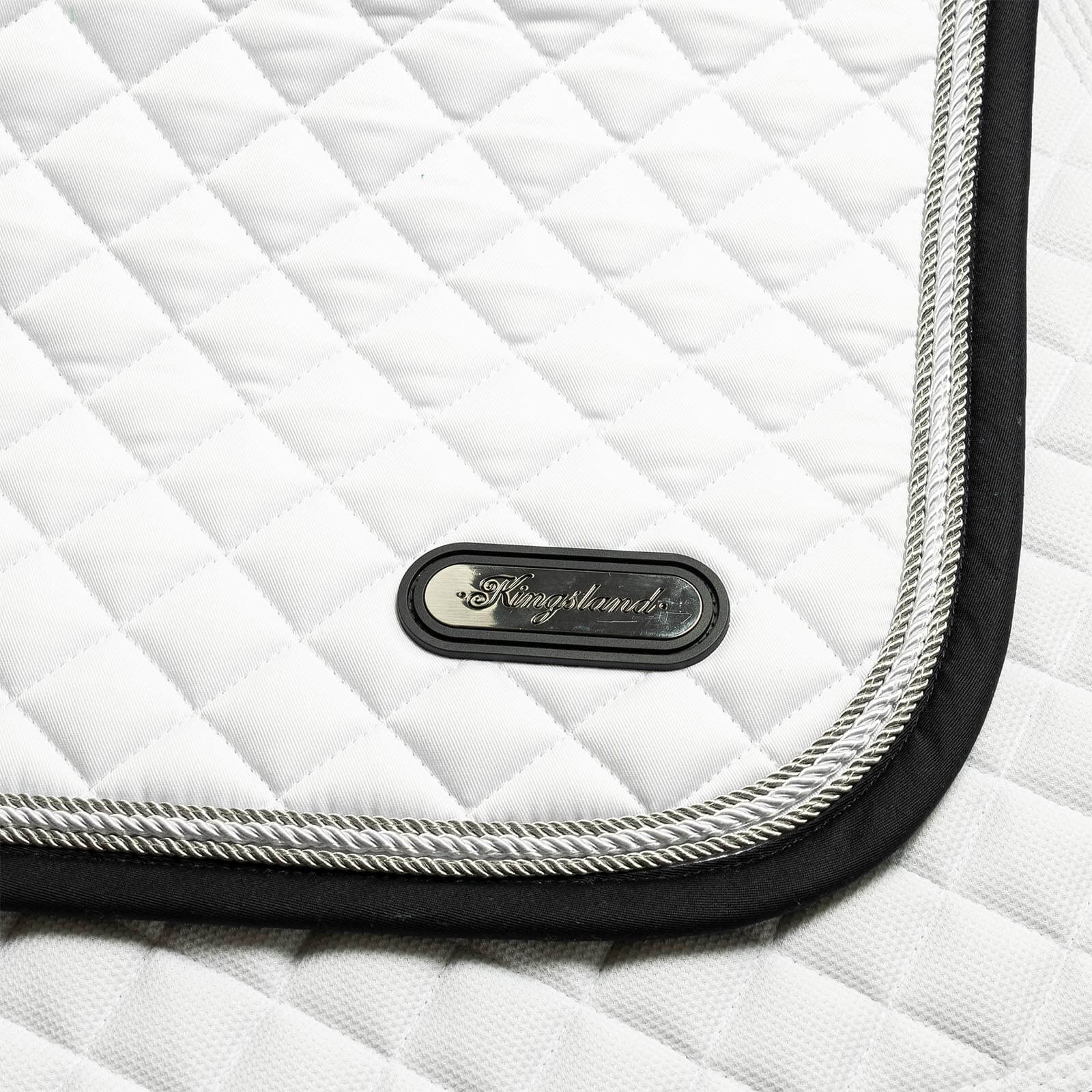 Die Schabracke besticht durch ihre elegante Rautensteppung, die nicht nur visuell beeindruckt, sondern auch für eine optimale Druckverteilung sorgt. Die kontrastierende Einfassung mit drei verzwirnten Seidenkordeln in Silber und Weiß verleiht ihr einen edlen Look, der sowohl auf dem Turnierplatz als auch im Alltag ein Statement setzt.
