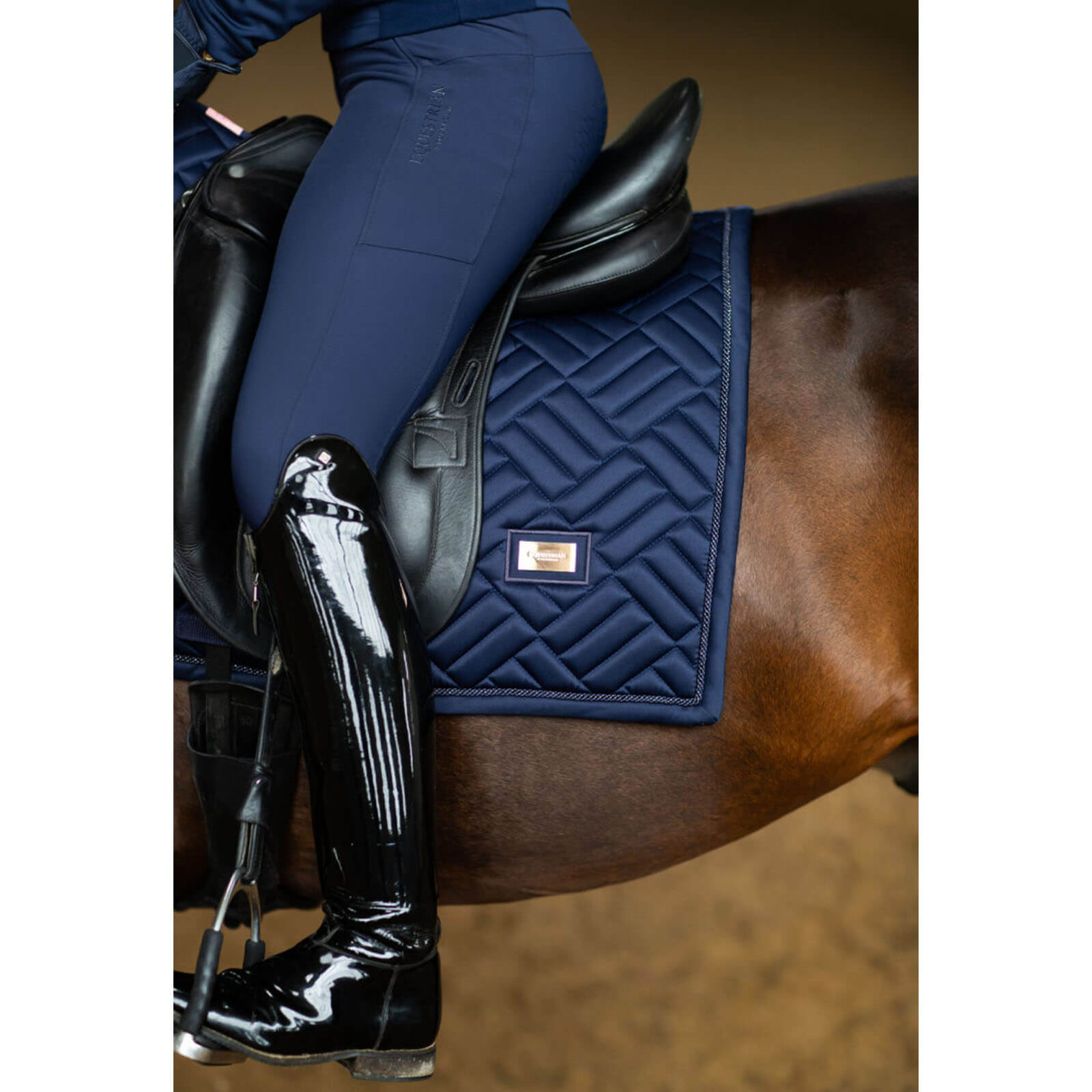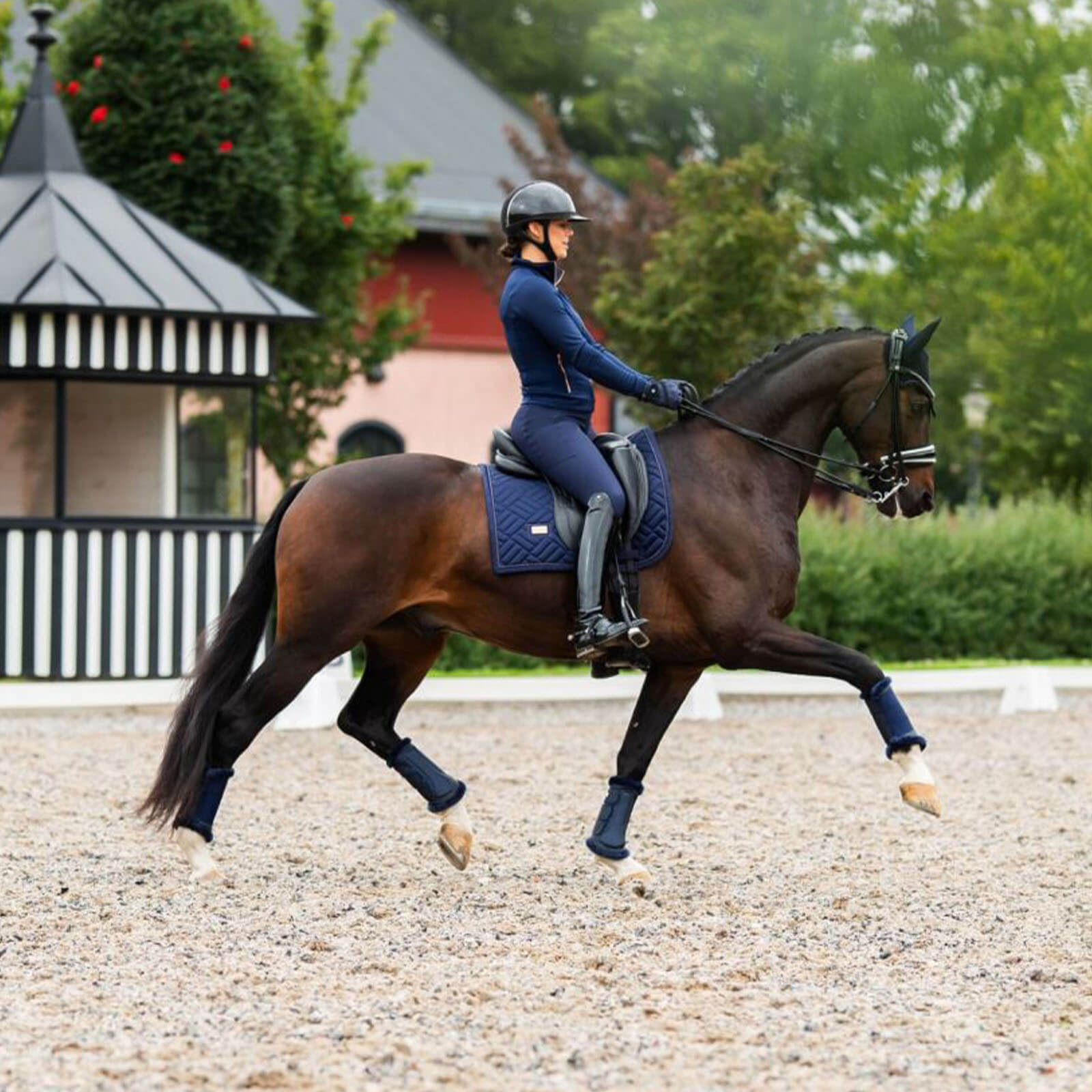 Die Schabracke Dressur Modern Lagoon Blush Dressurschabracke besticht durch ihre exquisite Labyrinthsteppung in einem tiefen Blau, akzentuiert mit edlen roségoldenen Details. Diese feinen Akzente verleihen der Schabracke eine luxuriöse Note, während das glänzende Equestrian Stockholm-Abzeichen den Look perfekt abrundet. Durch das besondere Design bleibt die Schabracke auch während anspruchsvoller Dressurlektionen an Ort und Stelle und sorgt für einen makellosen Auftritt.