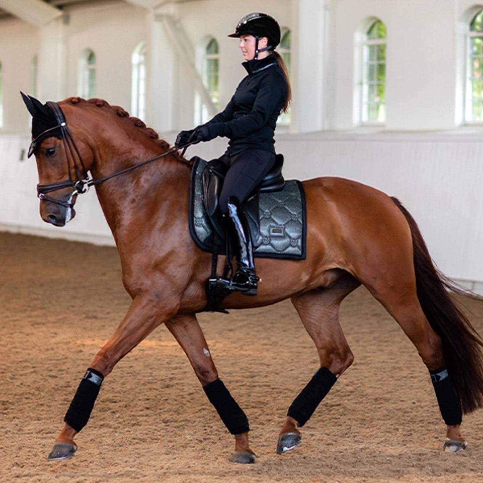 Die Dressurschabracke Dressage Northern Light Glimmer HW 2023 ist ideal für alle Dressureinheiten und verleiht deinem Reitoutfit das gewisse Extra. Pflegeleicht und langlebig, lässt sie sich mühelos mit anderen Stücken aus der Polar Night Glimmer Kollektion kombinieren. Verleihe deinem Reittraining einen Hauch von Luxus und genieße die Qualität, die Equestrian Stockholm bietet.