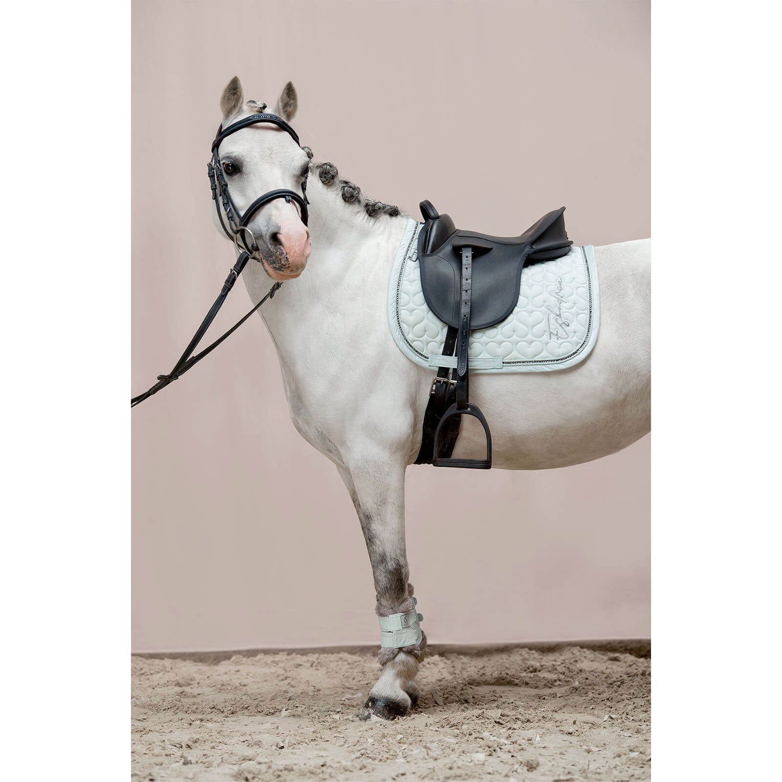 Das glitzernde Baumwoll-Obermaterial der Schabracke zieht alle Blicke auf sich und verleiht deinem Outfit eine exklusive Note. Die aufwendige Herz-Steppung sorgt nicht nur für ein ansprechendes Erscheinungsbild, sondern bietet auch zusätzliche Polsterung für dein Pferd. Kombiniert mit der eleganten Kordel-Kristallkordel-Kordel-Kombination und vertikalen Kristall-Schriftzügen, wird jedes Detail zu einem Statement in der Dressurwelt.