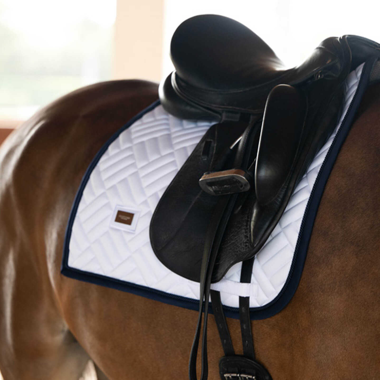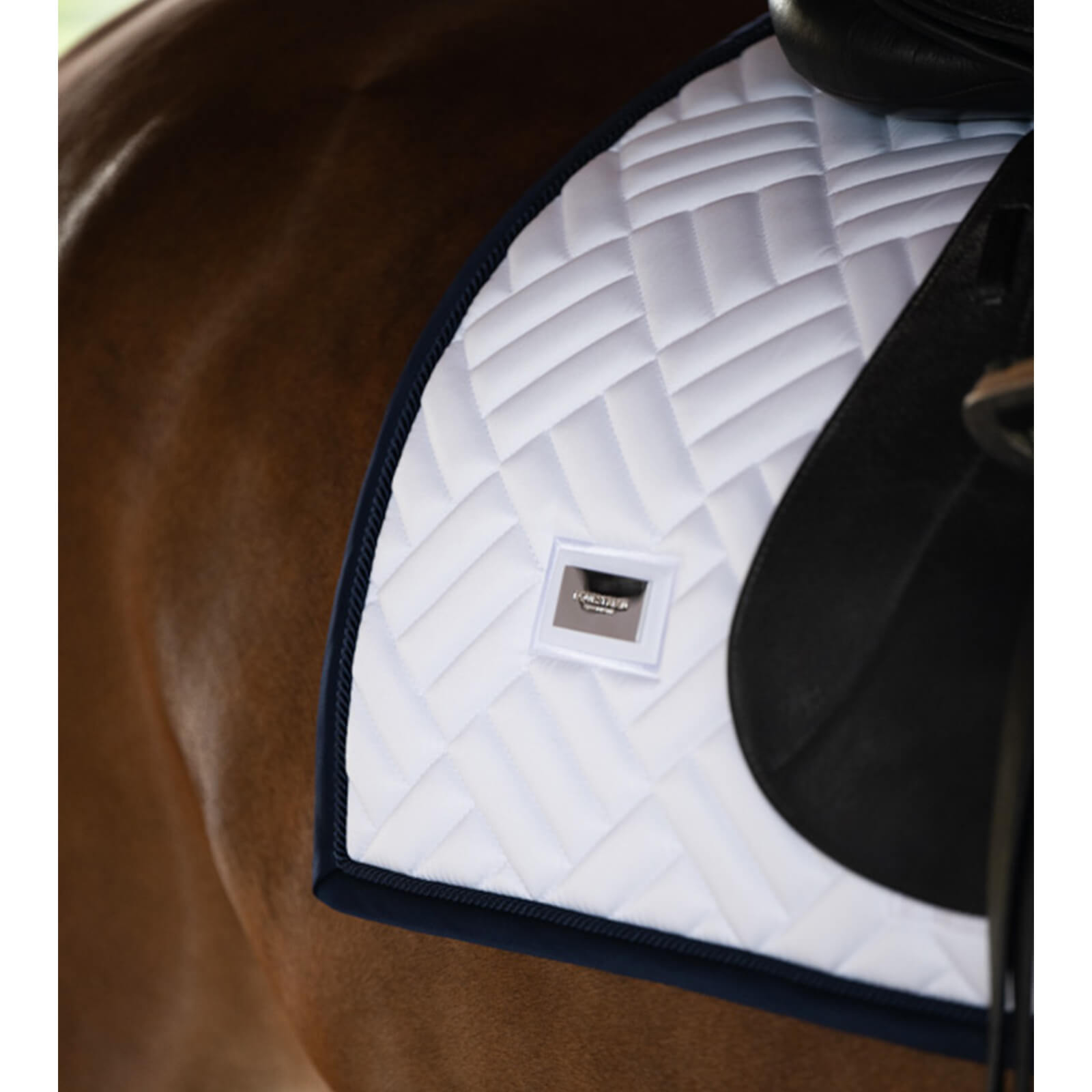 Mit ihrer weißen Farbe und den feinen Silberdetails setzt die Schabracke Dressur Modern White Navy stilvolle Akzente. Die moderne Steppung und das charakteristische Equestrian Stockholm Logo auf einem silbernen Metallabzeichen verleihen ihr einen edlen Look. Diese Schabracke ist nicht nur ein optisches Highlight, sondern bietet durch ihre clevere Gestaltung auch optimale Passform und Stabilität im Sattel.