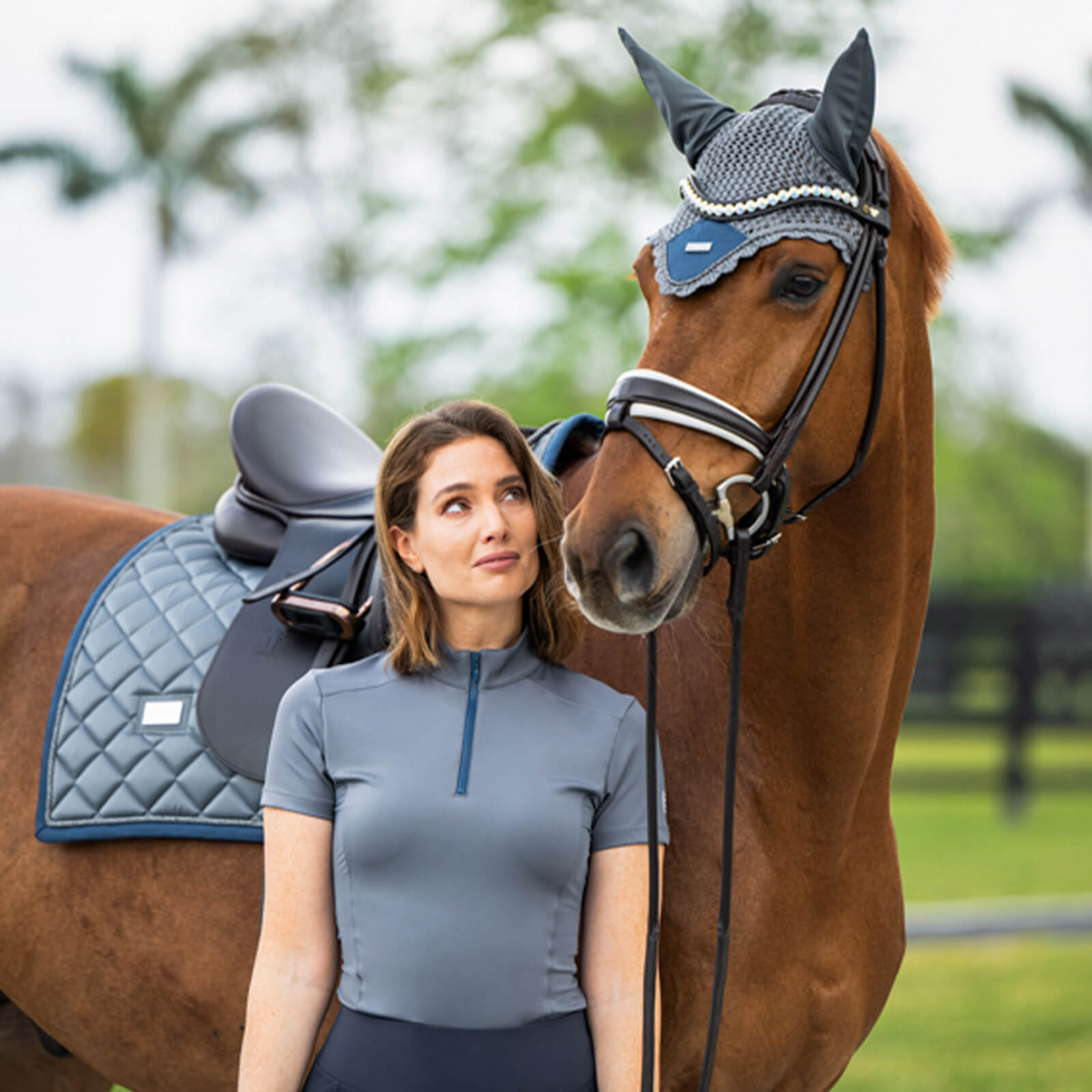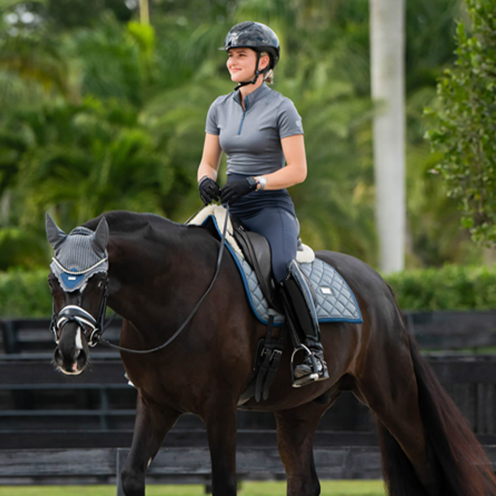 Die Dressurschabracke Metallic Blue besticht durch ihre elegante Farbgebung in einem schimmernden Blauton mit raffinierten silbernen Akzenten. Der Ton-in-Ton Paspel und der metallische Faden verleihen ihr eine besonders luxuriöse Optik. Dank der anatomischen Passform liegt die Schabracke optimal auf dem Pferderücken, ohne Druckstellen zu verursachen.