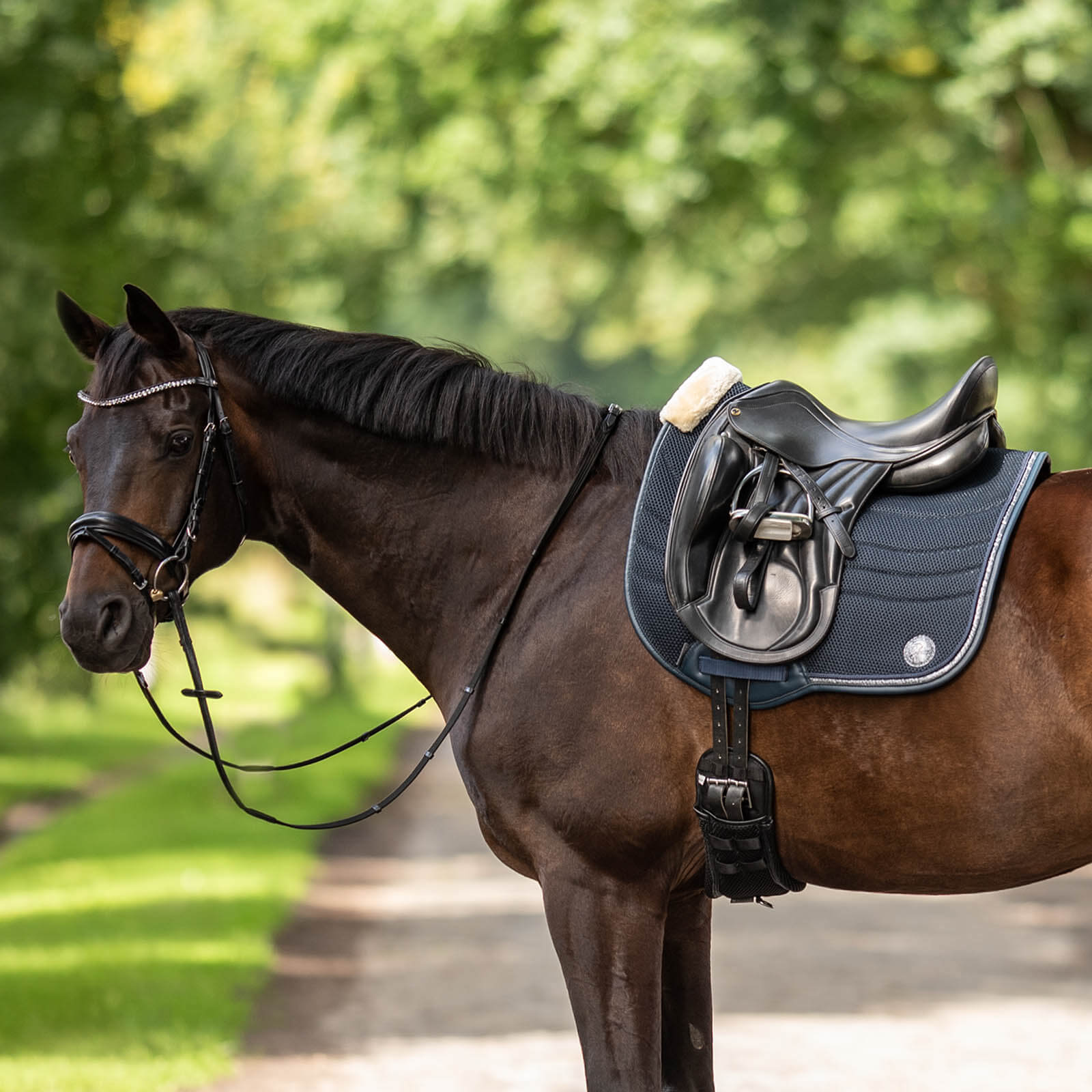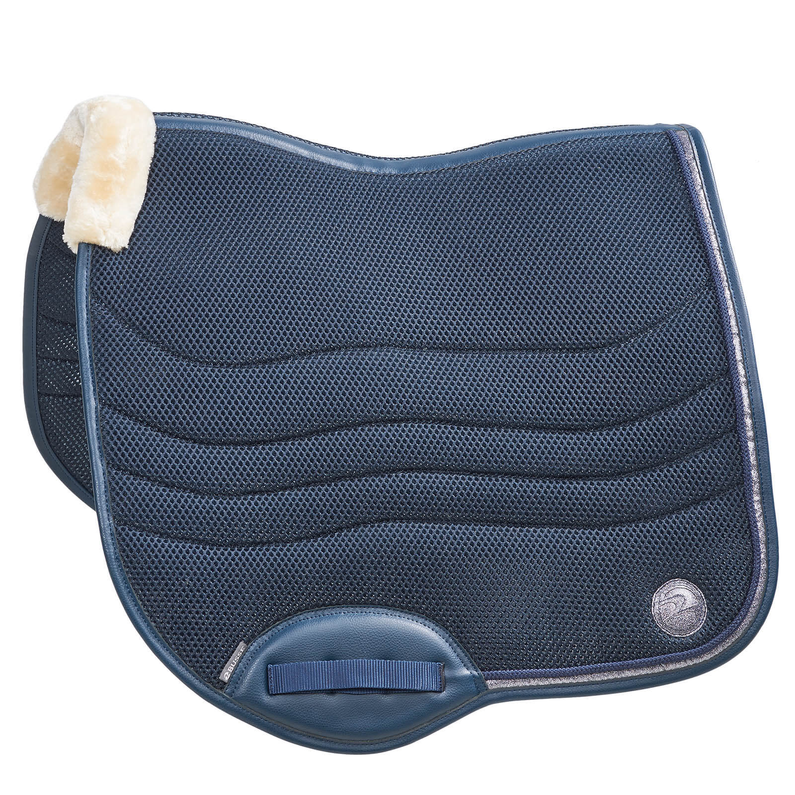 Einzigartige Dressurschabracke aus hochfunktionellem, innovativem 3D AIR® EFFECT Mesh-Material. Die Zierkordel mit Glitzerrand sowie die Glitzer-Logoapplikation zusammen mit dem weichen Widerristpolster aus kuscheligem Kunstfell verleihen eine klassisch-elegante Optik im Viereck.