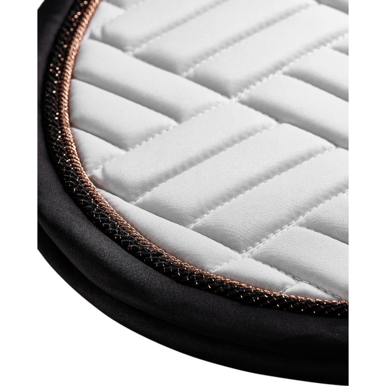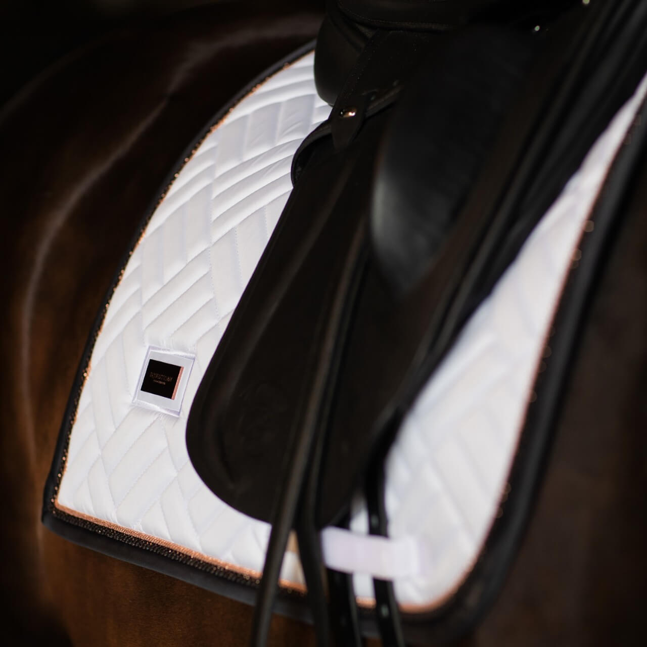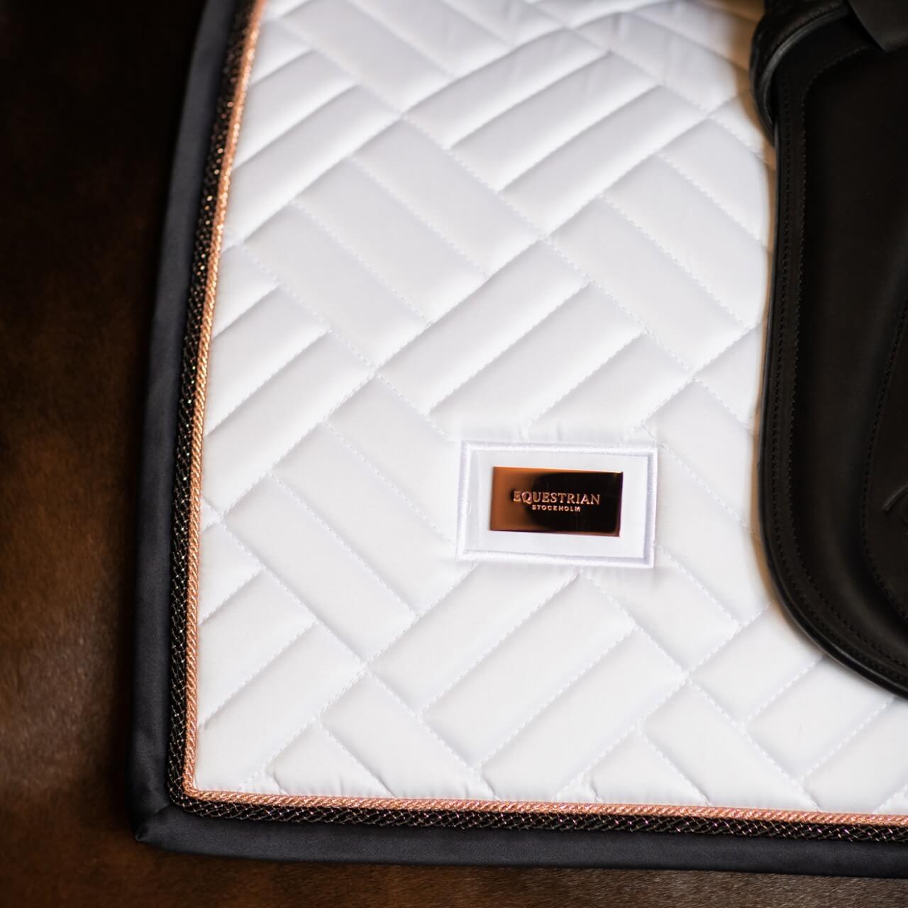 Die außergewöhnliche Steppung und der elegante Farbmix aus strahlendem Weiß und tiefem Ozeanblau machen die Schabracke zu einem echten Hingucker. Die roségoldenen Details verleihen ihr einen luxuriösen Touch, während das dezente Markenemblem den exklusiven Charakter unterstreicht. Die ergonomische Form sorgt nicht nur für einen sicheren Halt unter dem Sattel, sondern harmoniert auch perfekt mit dem Rücken deines Pferdes.