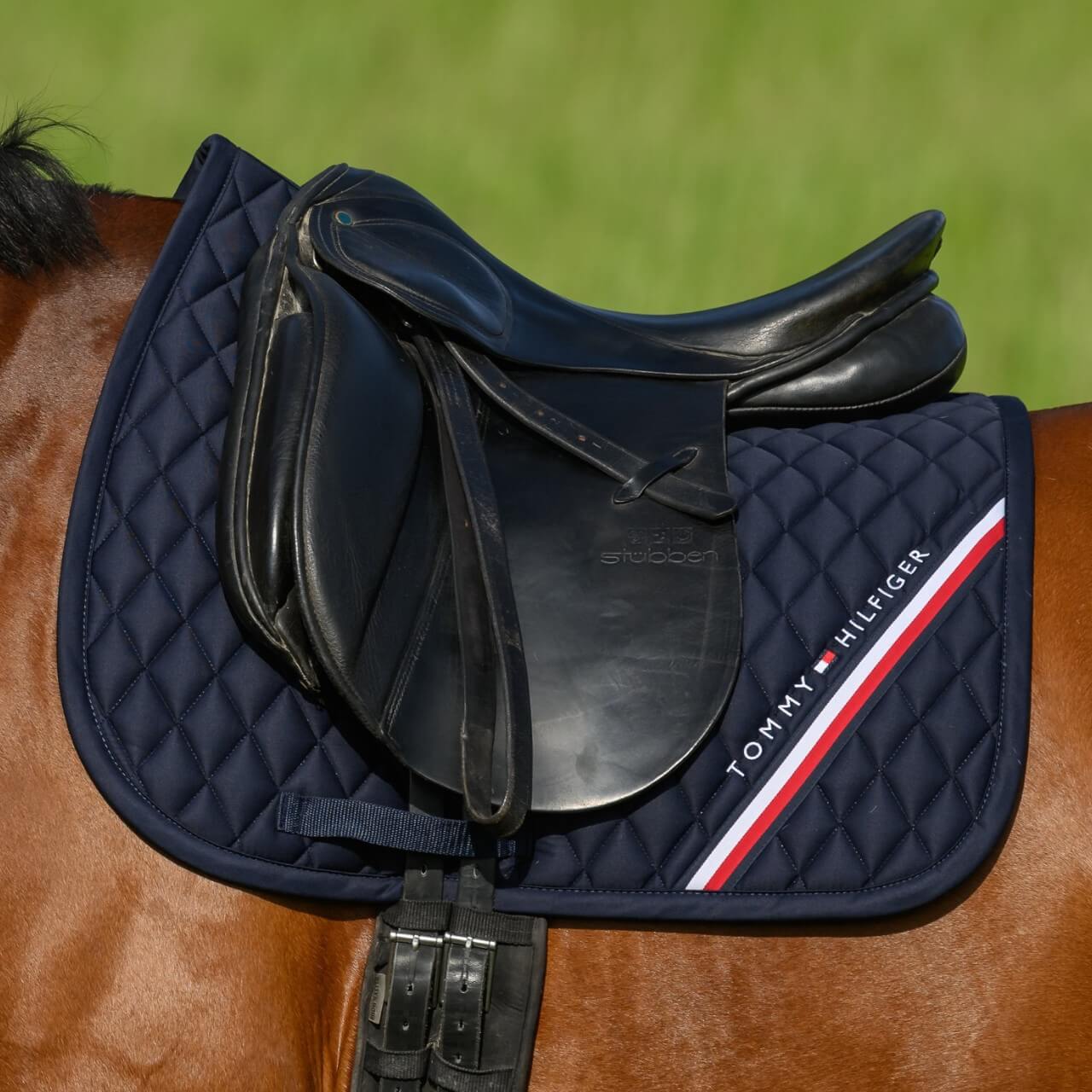 Die Dressurschabracke zeigt sich mit einer klassischen Rautensteppung, die den Look zeitlos und edel wirken lässt. Auf beiden Seiten ist das ikonische Global Stripe Branding eingearbeitet, das sofort die Handschrift von Tommy Hilfiger erkennen lässt. Eine dezente Logo-Stickerei verleiht der Schabracke zusätzlichen Markencharakter. Damit unterstreichst du deinen Sinn für Stil und setzt auf eine Kombination aus Modebewusstsein und Funktionalität. Diese Schabracke passt perfekt zu Reitern, die Wert auf Design und Wiedererkennung legen. Dein Pferd erhält ein Accessoire, das Eleganz und Individualität vereint.