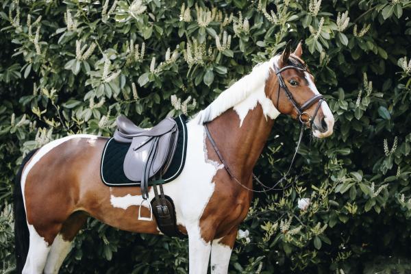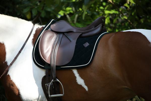 Die edle Cordstruktur der Dressurschabracke verleiht deinem Reitoutfit einen Hauch von Luxus. Die präzise Diamantsteppung und die gedrehte Bordüre sind nicht nur visuell ansprechend, sondern bieten auch zusätzliche Stabilität. Die Schabracke ist in den eleganten Farben Schwarz, Bordeaux und Tannengrün erhältlich, sodass sie perfekt zu deinem persönlichen Stil passt.
