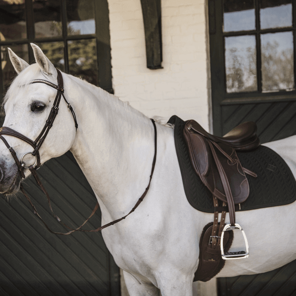 Die Dressurschabracke Fishbone Sattelunterlage beeindruckt durch ihr einzigartiges Fischgrät-Steppmuster, das deinem Pferd ein edles Aussehen verleiht. In klassischen Farben wie Navy, Schwarz und Weiß erhältlich, passt sie sich jedem Dressur-Outfit an und sorgt für einen harmonischen Gesamteindruck. Das dezente Lederlogo fügt sich nahtlos ein und bietet dennoch Platz für individuelle Bestickungen.