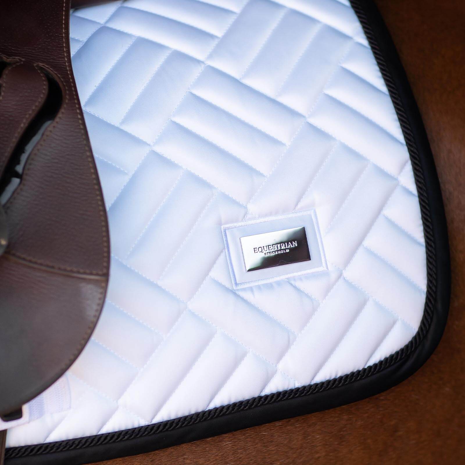 Die Schabracke Springen Modern White Black Edition besticht durch ihr modernes Labyrinth-Steppmuster in Weiß, akzentuiert durch edle schwarze und silberne Details. Das silberne Equestrian Stockholm Abzeichen verleiht ihr eine exklusive Note. Dieses Design ist nicht nur ein optisches Highlight, sondern bietet auch eine optimale Passform für dein Pferd.